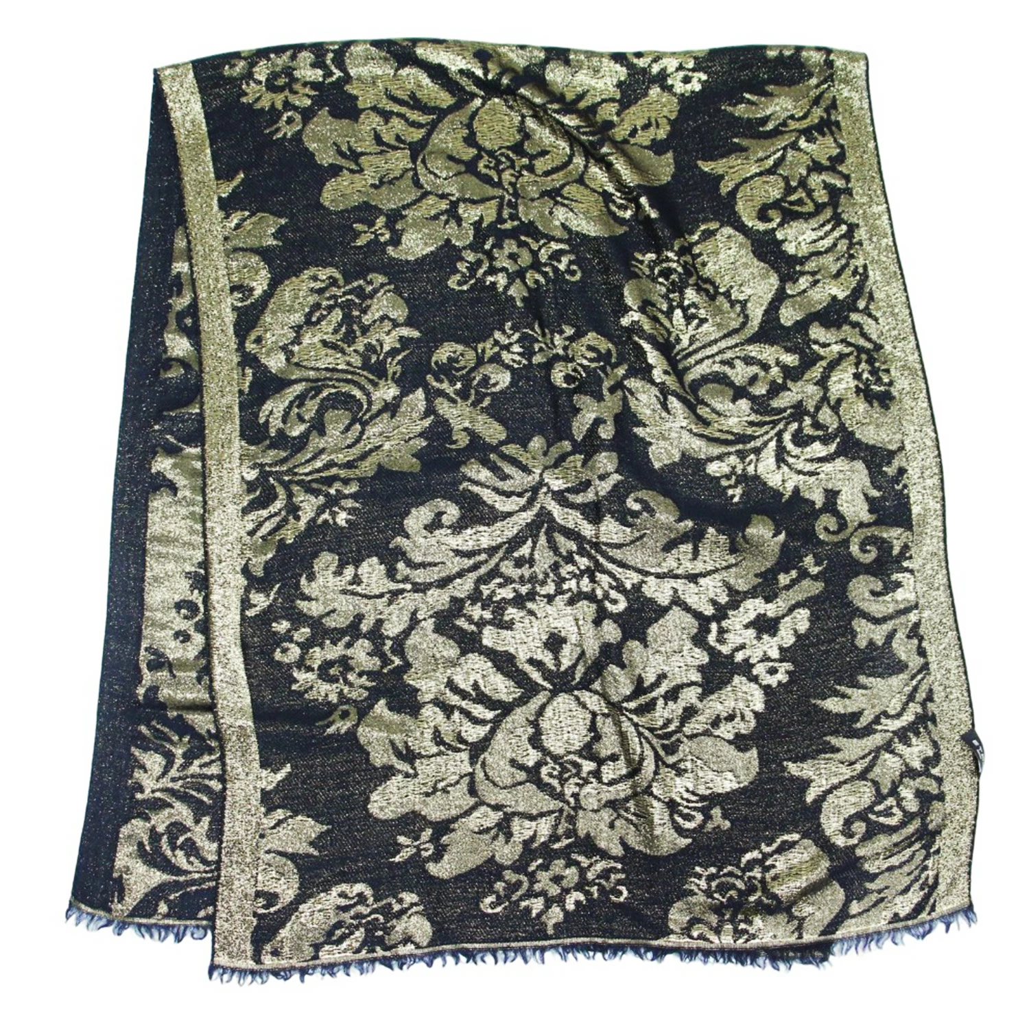ETRO Black and Gold Stole with Glitter Fringe, Large Metallic Floral Print, Made in Italy, Fashion Accessory, Women's, Pre-owned, K4614