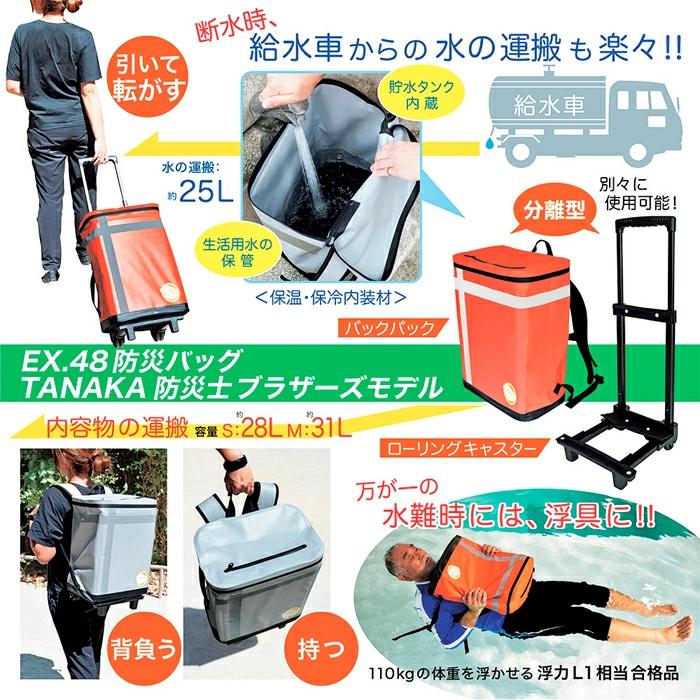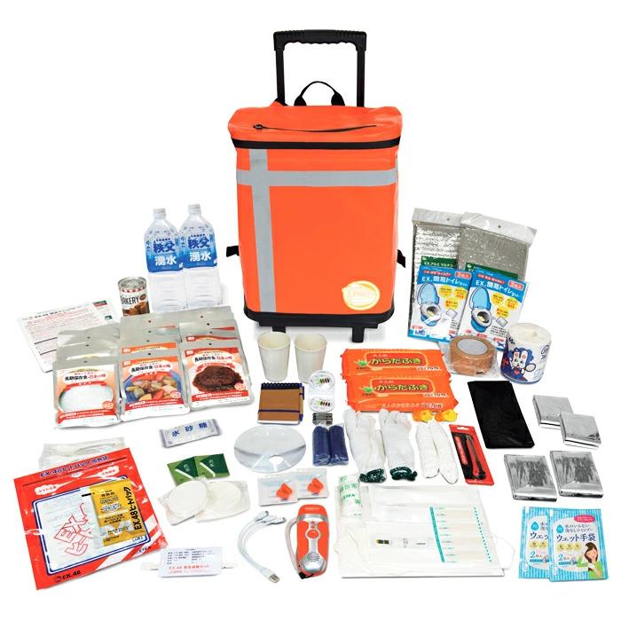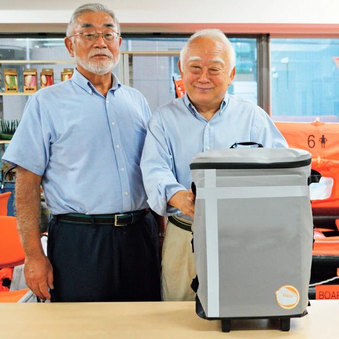 累計百万台販売のベストセラーが20年ぶりにフルモデルチェンジ、高機能・多機能製品満載の安心セット。キャスター付バッグは、密閉防水で「浮き具」になり、急増する水害対策に!お届け時点の残存賞味期限は3年以上保障。画像は本モデル考案者の田中昌男(メーカー代表取締役社長/防災士/兄)画像右と田中廣(防災士/弟)画像左です。