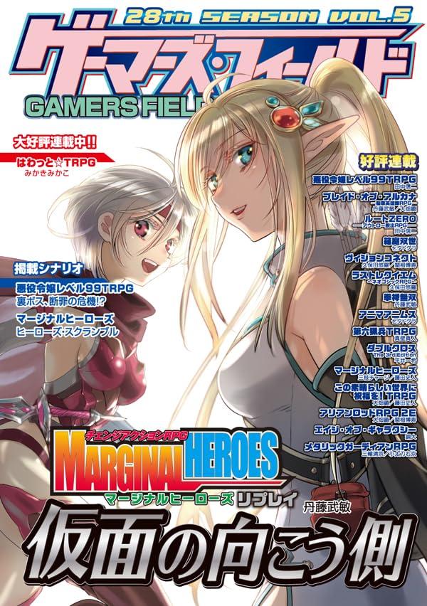 隔月発売のTRPGサポート誌「ゲーマーズ・フィールド」の28th Seasonの5冊目。 巻頭は、七夕さとり先生著書の『悪役令嬢レベル99 ~私は裏ボスですが魔王ではありません~』を原作とする『悪役令嬢レベル99TRPG』の他、 『マージナルヒーローズ サプリメント チバシティガイド』、『アリアンロッドRPG2E サプリメント ミソロジーガイド』、 『ブレイド・オブ・アルカナ-聖痕英雄譚RPG- スーパシナリオサポート Vol.01 虚言つむぐ蜘蛛』など、今夏からそれ以降にかけての新作情報を掲載。 今号では『チェンジアクションRPG マージナルヒーローズ』のリプレイ「仮面の向こう側」を掲載。 最新サプリメント『チバシティガイド』の紹介も兼ねて、ルールやデータを導入したリプレイとなっています。 “英雄の街”チバシティ。 ヒーロー指定都市のこの都市で、今話題になっているのは、ヒーローに理解ある市議会議員が主張したヒーロー実名登録制。 この制度を巡って、ヒーローたちも揺れていた。 しかし、この裏には影衆のヴィラン、コダマの陰謀があった……。 みかきみかこ先生によるTRPG紹介4コママンガ『はわっと★TRPG』では、新作『悪役令嬢レベル99TRPG』で遊んだ様子をお届け、 原作愛に溢れる『悪役令嬢レベル99TRPG』の面白さをギュギュッと濃縮してお送りします。 その他、『悪役令嬢レベル99TRPG』、『マージナルヒーローズ』、『ブレイド・オブ・アルカナ―聖痕英雄譚RPG―』、『ダブルクロス The 3rd Edition』、 『この素晴らしい世界に祝福を!TRPG』、『箱庭双世』、『ヴィジョンコネクト』、『ラストレクイエム~ネオゴシックRPG~』、『メタリックガーディアンRPG』、 『アニマアニムス』、『拳禅無双』、『エイジ・オブ・ギャラクシー』、『アリアンロッドRPG 2E』などの商品のサポート記事を掲載。 表紙イラスト:四季童子 発売元:有限会社ファーイースト・アミューズメント・リサーチ 版型:書籍タイプ・B5 版型 :書籍タイプ・B5