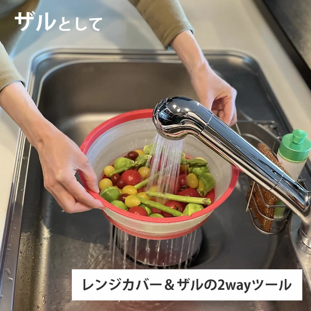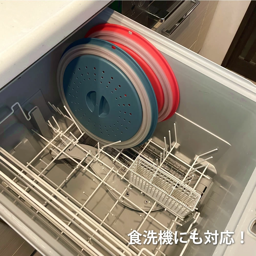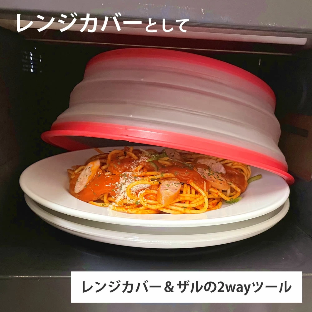 【商品情報】レンジカバー&ザルの2wayツールたためば厚さは2cmに!壁掛け出来るから収納もラクラク!食洗機対応フードカバーとしてもご利用いただけます