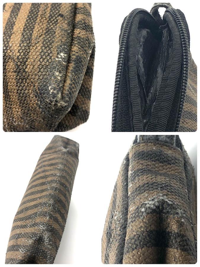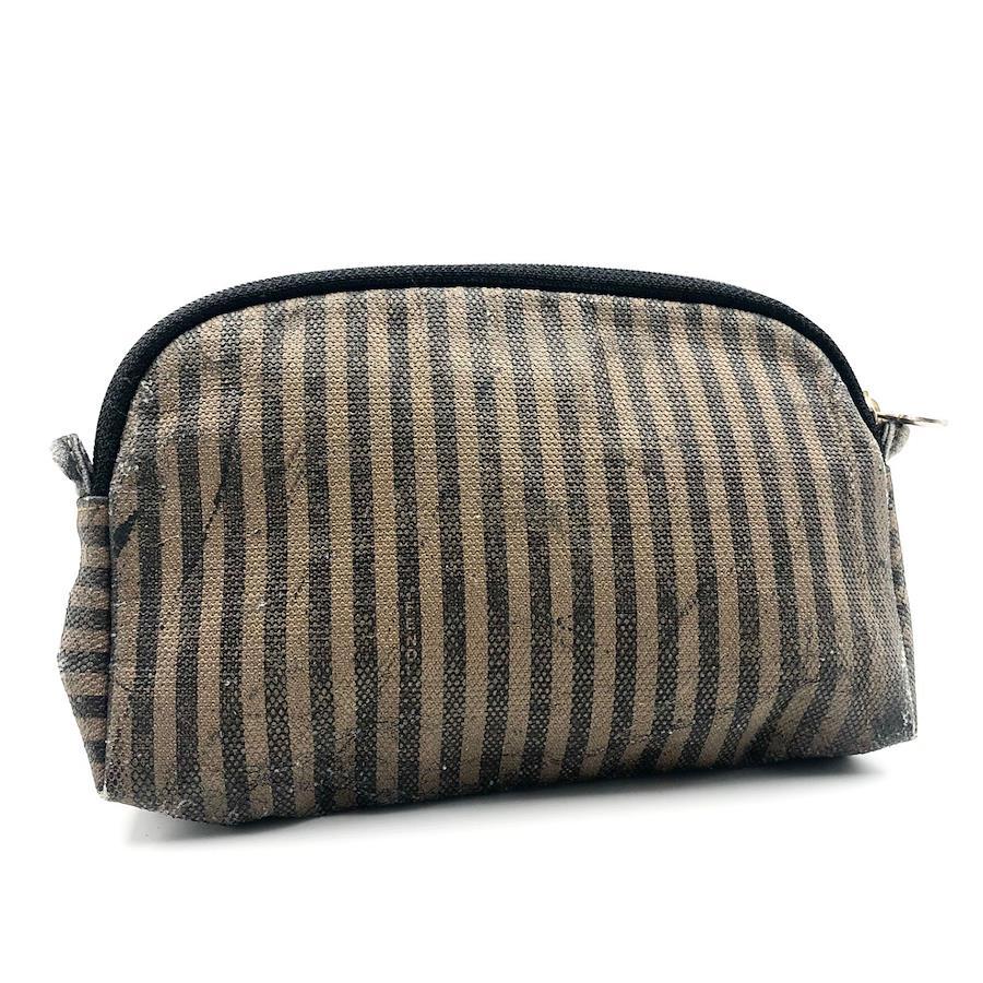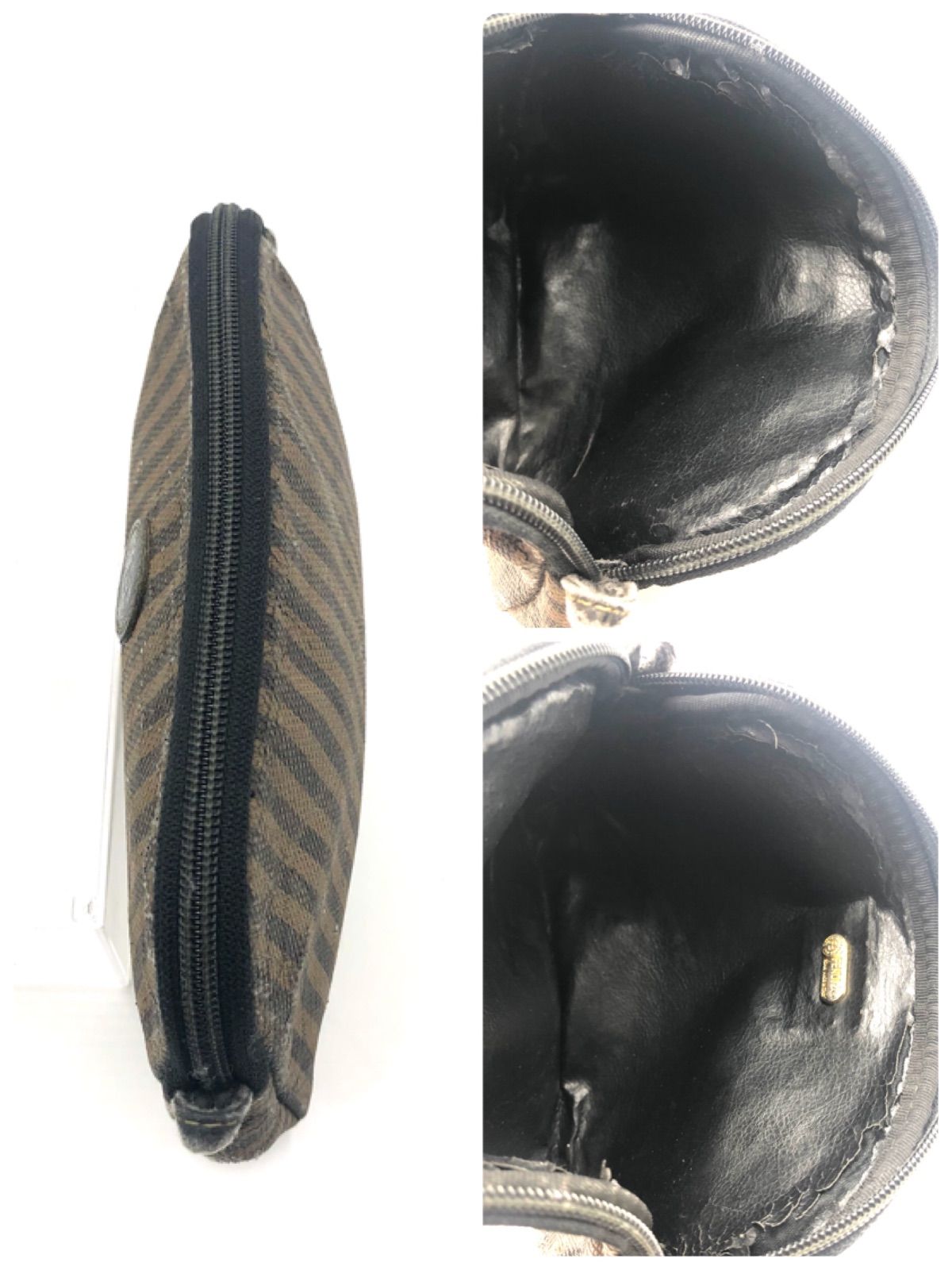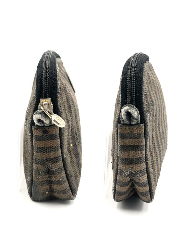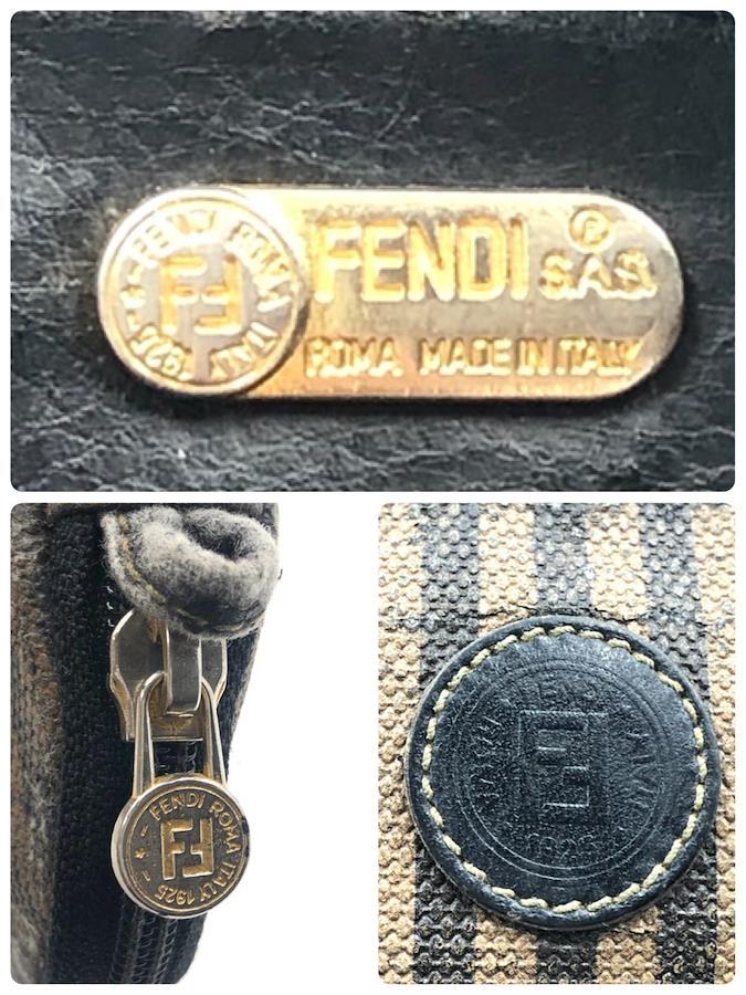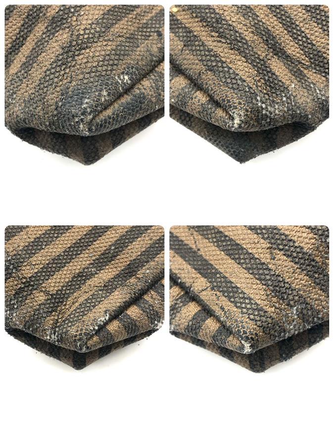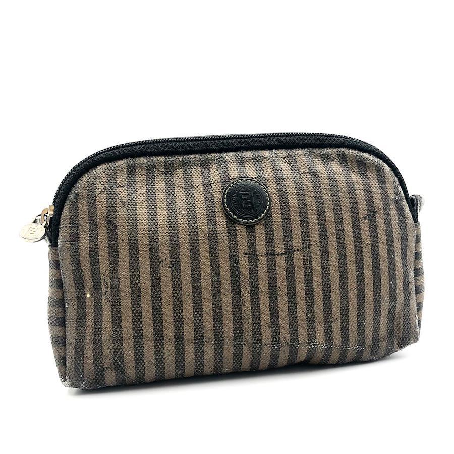 ■商品概要FENDI フェンディペカンミニポーチコーティングキャンバスストライプブラウン系ゴールド金具ロゴプレートイタリア製