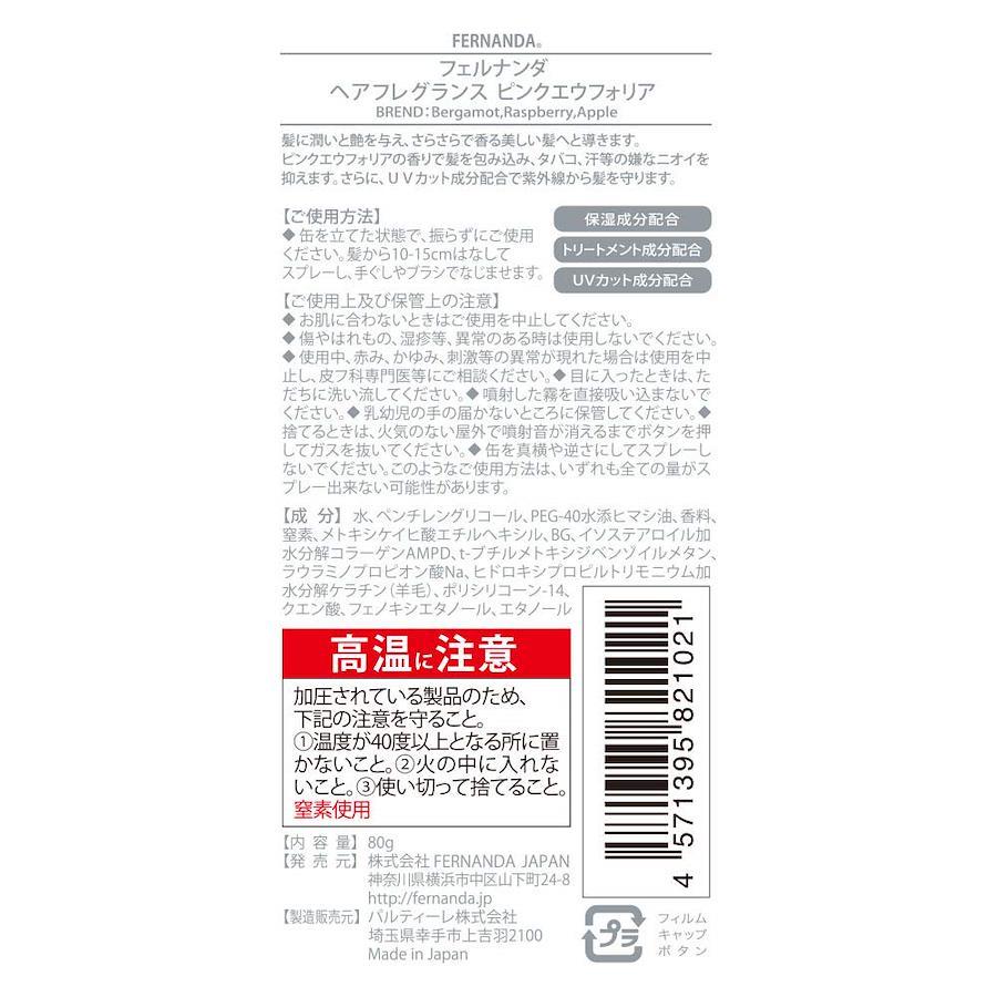 ブランド フェルナンダ商品の形状 スプレー商品体積 80 ミリリットル香り フローラル特徴 うるおい・保湿 UVカット配合