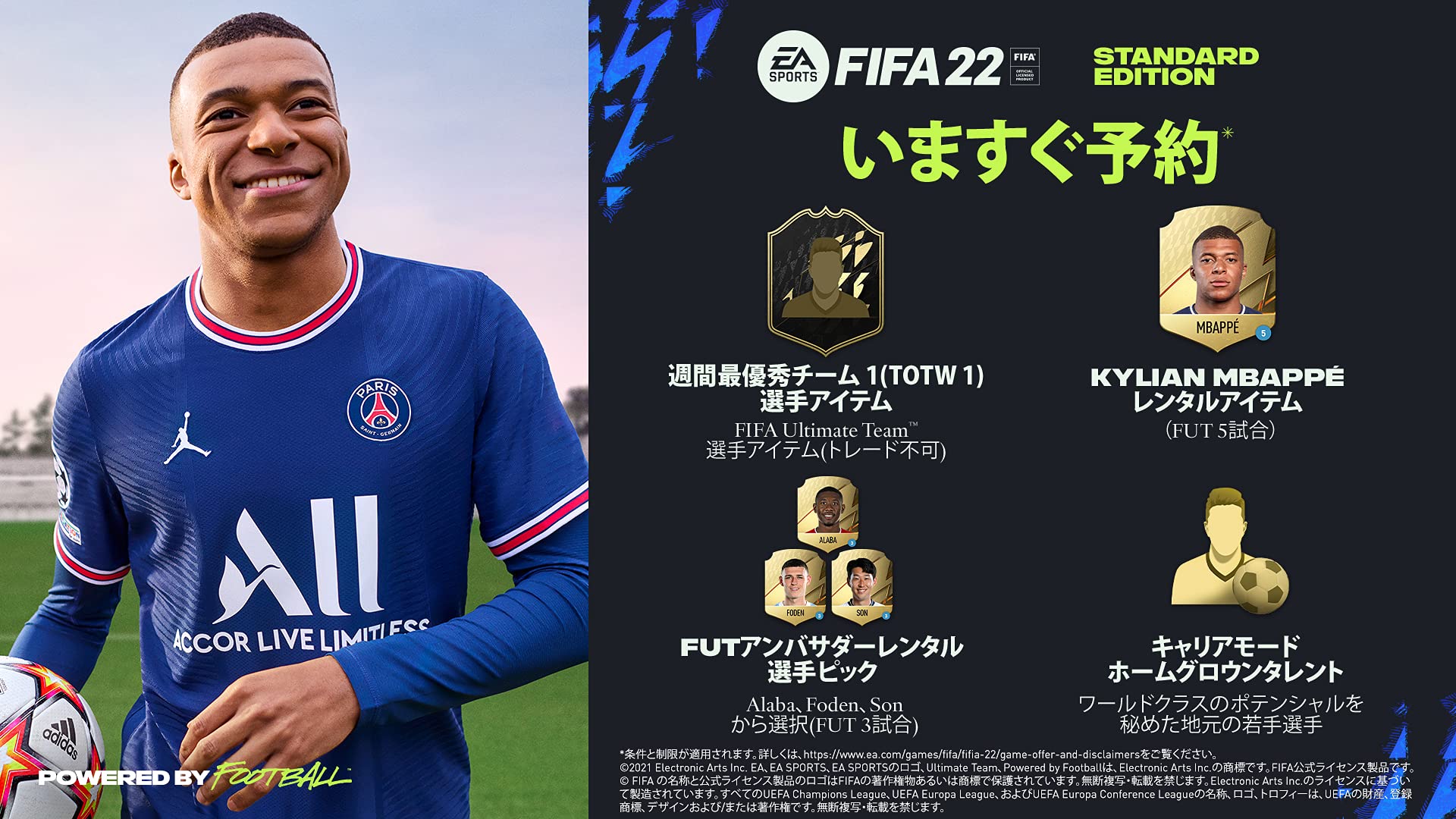Powered by FootballHYPERMOTIONゲームプレイテクノロジーEA SPORTS FIFAと次世代コンソールで新たに採用されたHyperMotionにより、お互いのテクノロジーがかつてないほどまでに融合。サッカーゲームのゲームプレイに革命をもたらします。次世代コンソール版「FIFA 22」の全モード・全試合で、かつてない臨場感やレスポンス、流れるようなゲームプレイを体験しましょう。キャリアモード「FIFA 22」のキャリアモードで夢のサッカーライフを体験し、クラブを作成して降格候補のクラブを強豪へと成長させましょう。一新された選手キャリアでは、プロのサッカーキャリアを様々な道で進め、目標を達成し、没入感あふれる体験を楽しむことができます。VOLTA FOOTBALLVOLTA FOOTBALLが帰ってきます。さらに華麗なプレイで自