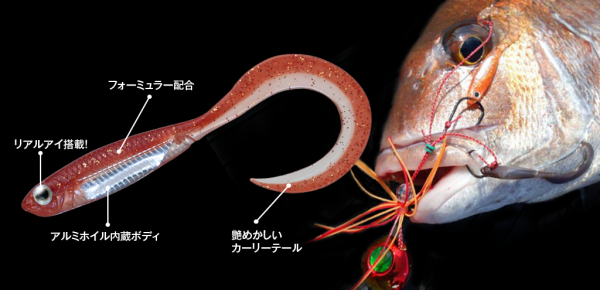 ネクタイとは違う厚みのあるカーリーテールは強い波動を生みだしながらも艶めかしいナチュラルなアクションで鯛にしっかりとアピールします。