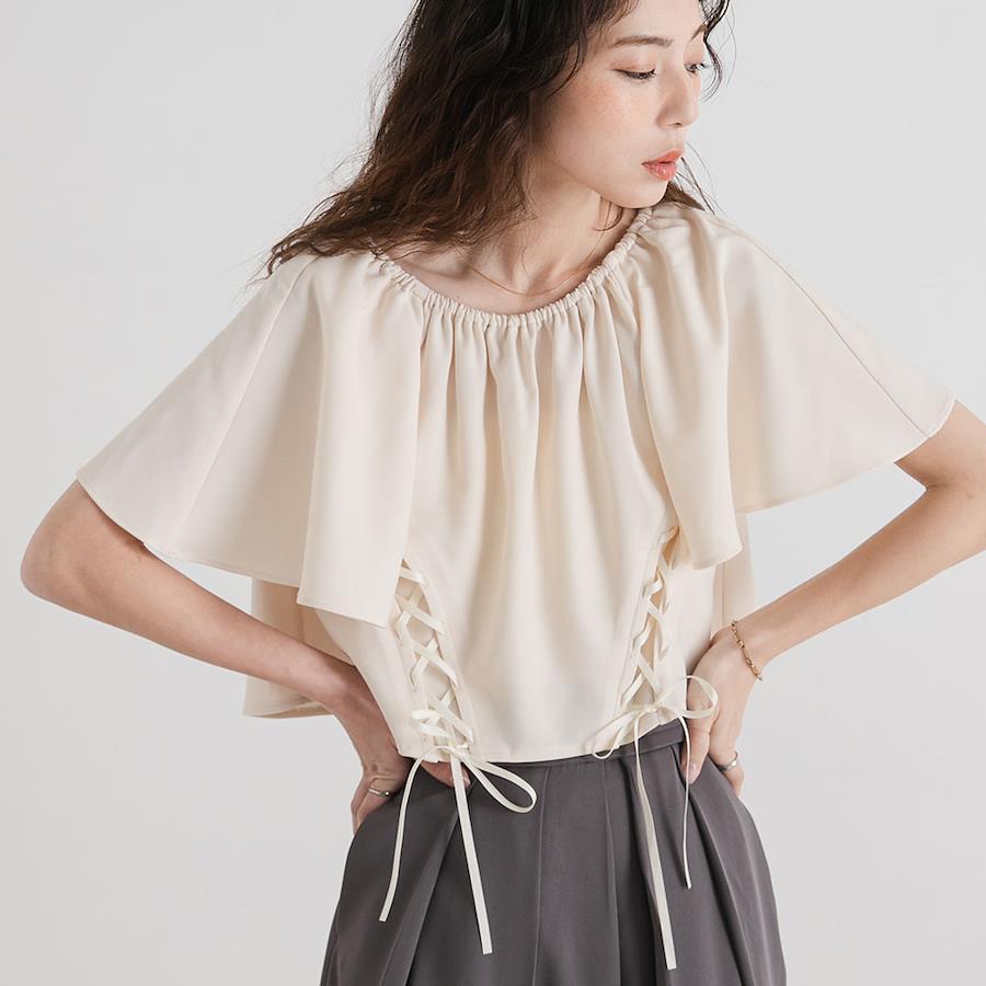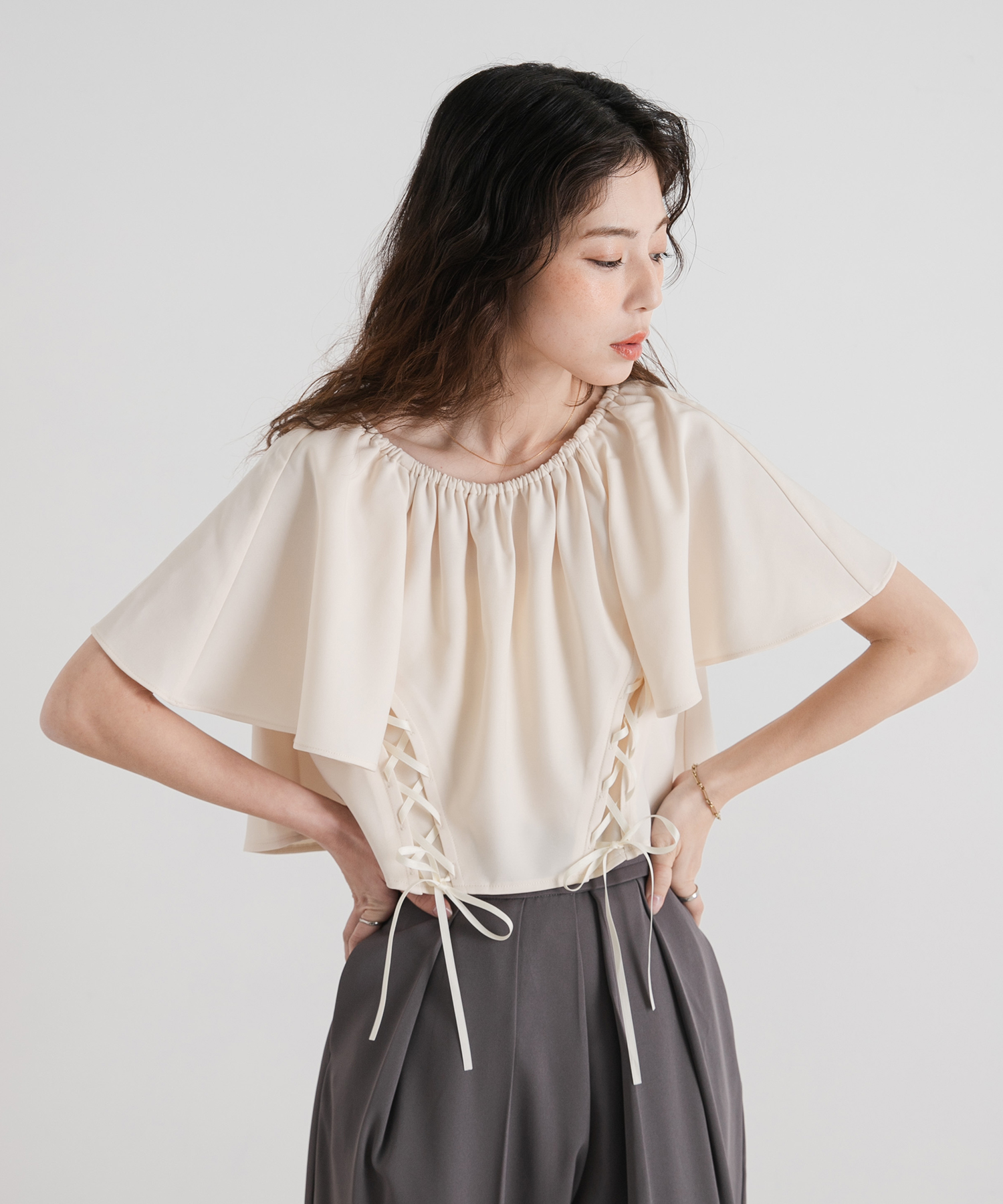 オフショルとしても着用可能なフレアスリーブレースアップトップス