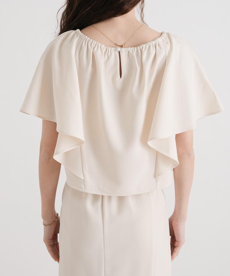 肩のフレアスリーブが気になる肩幅と二の腕周りを自然にカバー。