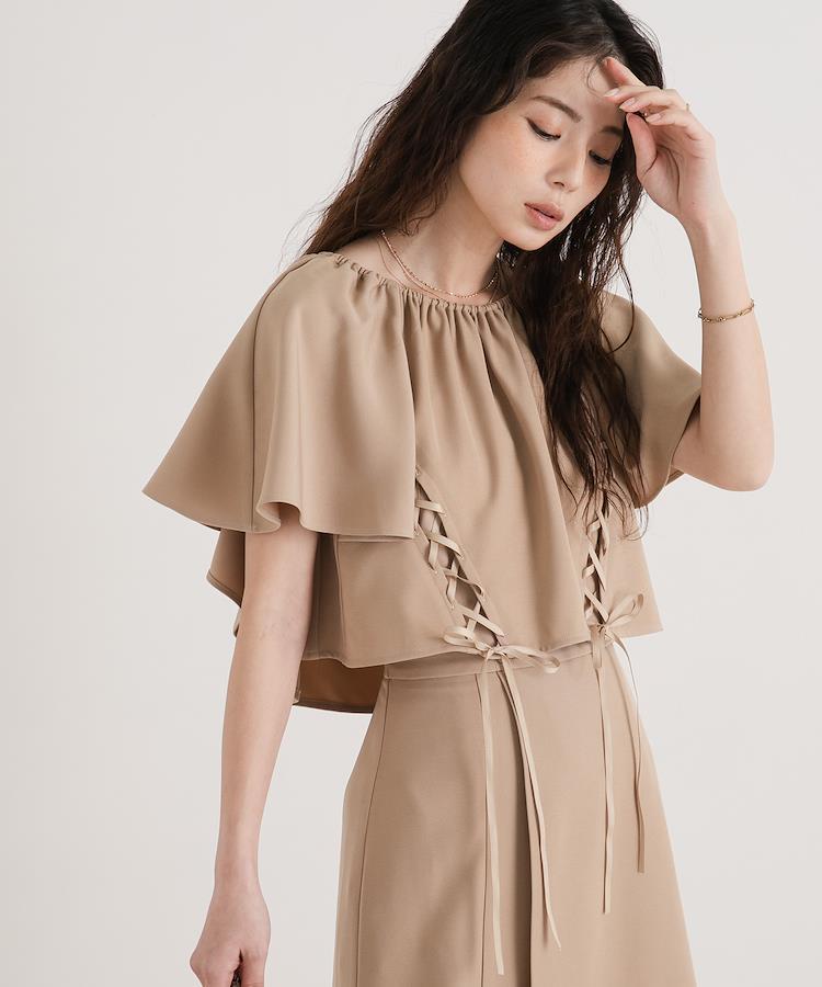 オフショルとしても着用可能なフレアスリーブレースアップトップス