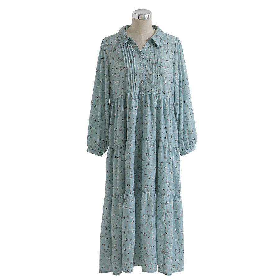 【ディティール】ティアード部分は、広がり過ぎず落ち感の良い素材でスッキリ見せ!首を長く見えるようにV字に開く衿ぐりがポイント◎前身頃には、ピンタックを入れて広く見えるのを解消したデザインに。少し高めのウエスト切り替えで、足長効果も抜群!メリハリシルエットが叶う1着です。スカート部分は透け防止のペチコート付きなので安心。