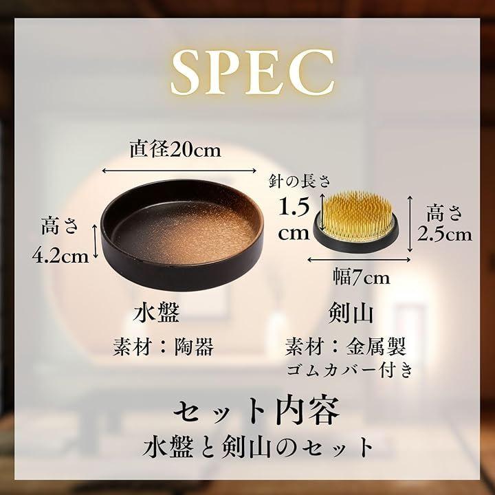「生け花・華道にぴったりの基本セット」 セット内容は、直径20cmの陶器製水盤1点と、直径7cmの丸剣山(ゴムリング付き)1点。