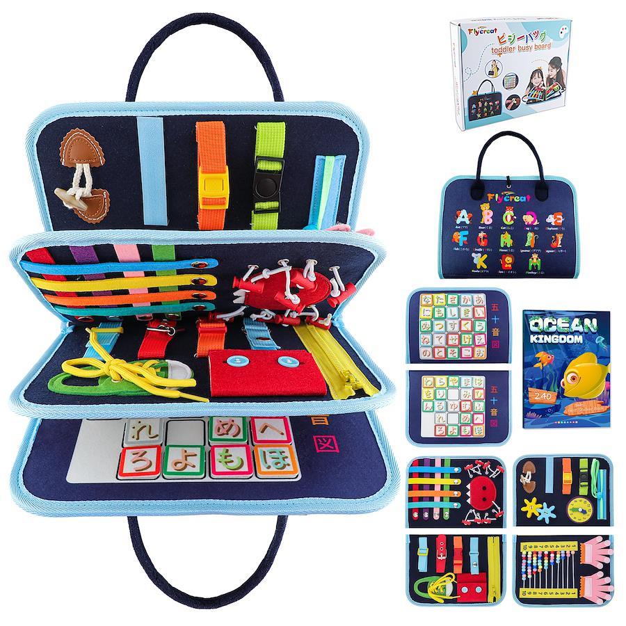 【こどもが夢中になるモンテッソーリ知育おもちゃ!】20種類のバラエティ豊かなボタン、バックル、靴紐、ジッパー、五十音順図などで遊べる、「モンテッソーリ」と呼ばれる知育用玩具です。一般に洋服についている留め具をまとめてあるオモチャで、子供の知力、創造性を刺激し、能力の開発に役立ちます。 【モンテッソーリ教育】Dr.Maria Montessoriの提唱するモンテッソーリ教育に沿ったおもちゃ教材です。モンテッソーリ教育の5分野マリア・モンテッソーリによって考え出された教具は,子供達のそれぞれの敏感期を元に、5つの分野(日常生活の練習、感覚教育、言語教育、算数教育、文化教育)に体系化されているおもちゃ。 【指先の鍛錬に】紐を引っ張ったり、チャックを開けたり、様々な動作が可能で、お子様の問題解決力や探究心を育てます。つなぐ、はずすを繰り返し、指先を動かすことで脳の活性化に繋がります。折りたたむことにより、バッグタイプに変形。持ち運びも容易です。お友達の家に一緒にもっていったり、車の中で遊んだり、どこでも気軽に遊べます。 【お着替えの練習に】衣類のよく使われている留め具、ボタンなどを網羅しており、お子様のお着替えの練習に役立ちます。安全性が高く、頑丈にできているので、子供たちも思いっきり遊べます。1~6歳のお子様の遊びにピッタリです。※0~1歳では力が必要なボタンは開けられない可能性があります。 【プレゼントにもピッタリ】知育玩具として最適.子供たちの集中力、思考スキル、論理・実践的なスキルを訓練し.、遊びの過程を通じて感情的なコントロールと圧力抵抗を改善することができます。赤ちゃん 入園祝い 子供用 女の子 男の子 誕生日 クリスマス プレゼントに最適なモンテッソーリの幼児用おもちゃ です。プチプラ価格でプレゼントにもちょっとしたギフトにも大変喜ばれています。商品の品質については万全を期しておりますが、万一商品が破損・汚れまたは不良品などがございましたら、商品に関して何か問題があれば、いつでもご連絡ください
