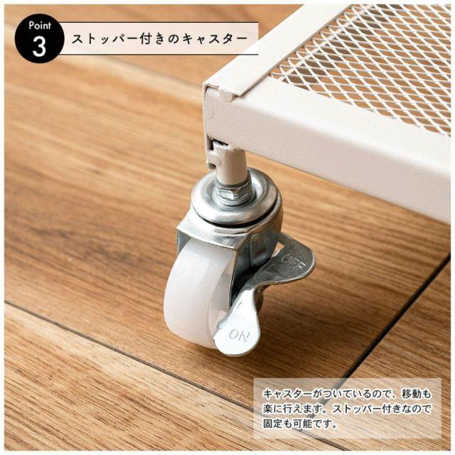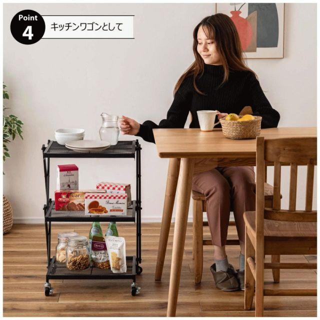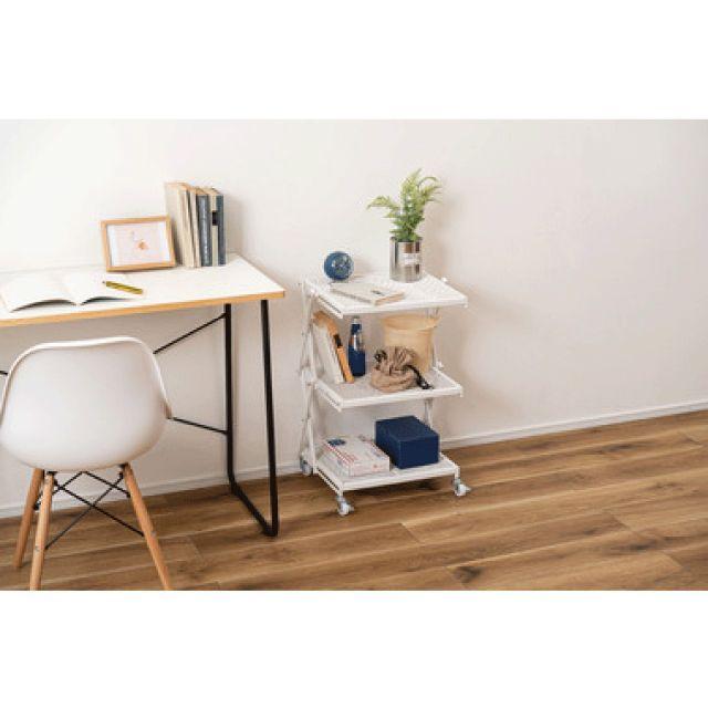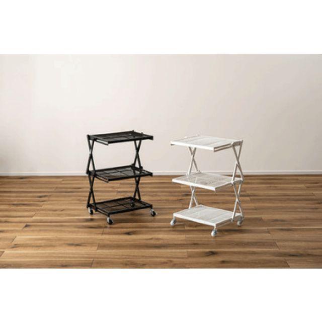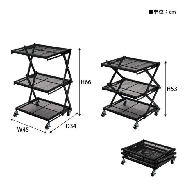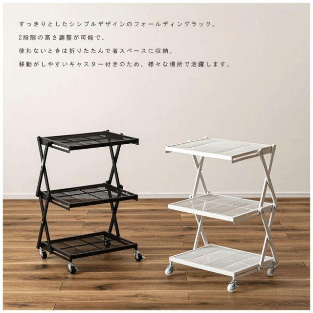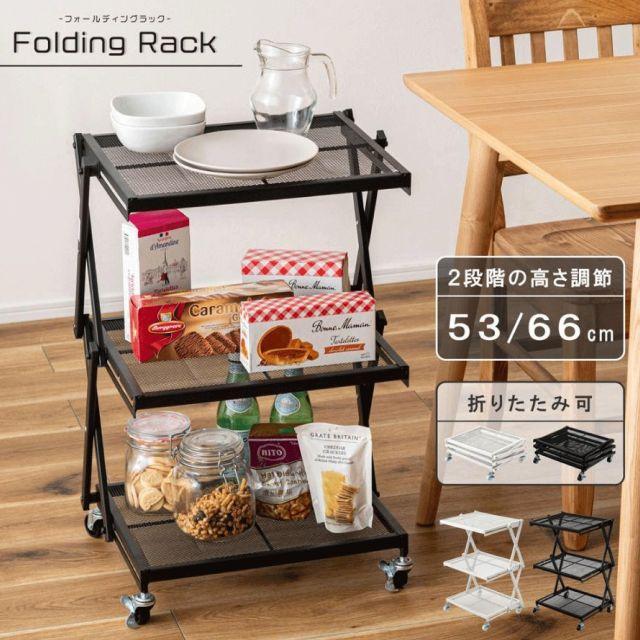 ●すっきりとしたシンプルデザインのフォールディングラック。●2段階の高さ調整が可能で、使わない時は折りたたんで省スペースに収納。●移動がしやすいキャスター付きなので様々な場所で活躍。●53cmと66cmの2段階で高さ調整ができるのが便利なポイント。●場所や用途に合わせて使えます。●簡単に折りたたみが可能で、使わない時はコンパクトに収納。●キャスター付きで移動も楽々。ストッパーも付いているので固定も可能。●キッチンワゴンとして。●デスク横のサイドラックとして。〈製品規格〉商品サイズ:W45×D34×H53/66cm商品重量:約4.5kg静的耐荷重:5kg材質:スチール(粉体塗装)組立:完成品機能:簡単折りたたみ式/2段階高さ調整生産国:中国