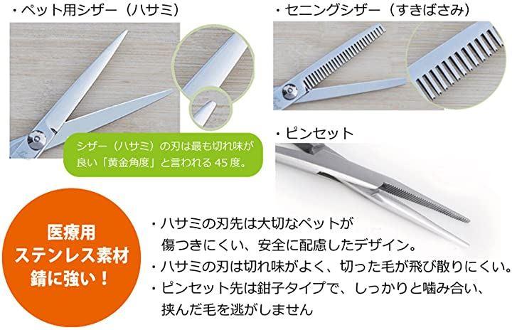 ・2種類のハサミとピンセットは、医療用ステンレス素材を使用し、錆に強く、手になじむデザインです。