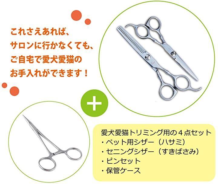 ・愛犬愛猫トリミング用の、ペット用シザー(ハサミ)・セニングシザー(すきばさみ)・ピンセット・保管ケースの4点セットです。