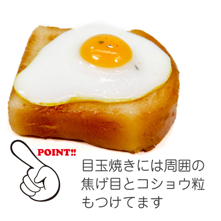 本物の目玉焼きトーストそっくりに作られた食品サンプルのアクセサリーです。大きさは約4.5cm×4cmのミニサイズの食パンにこんがり焦げ色を付け、本物そっくりに作られた目玉焼きをのせてみました。裏側にもリアルな焦げ色を付けました。
