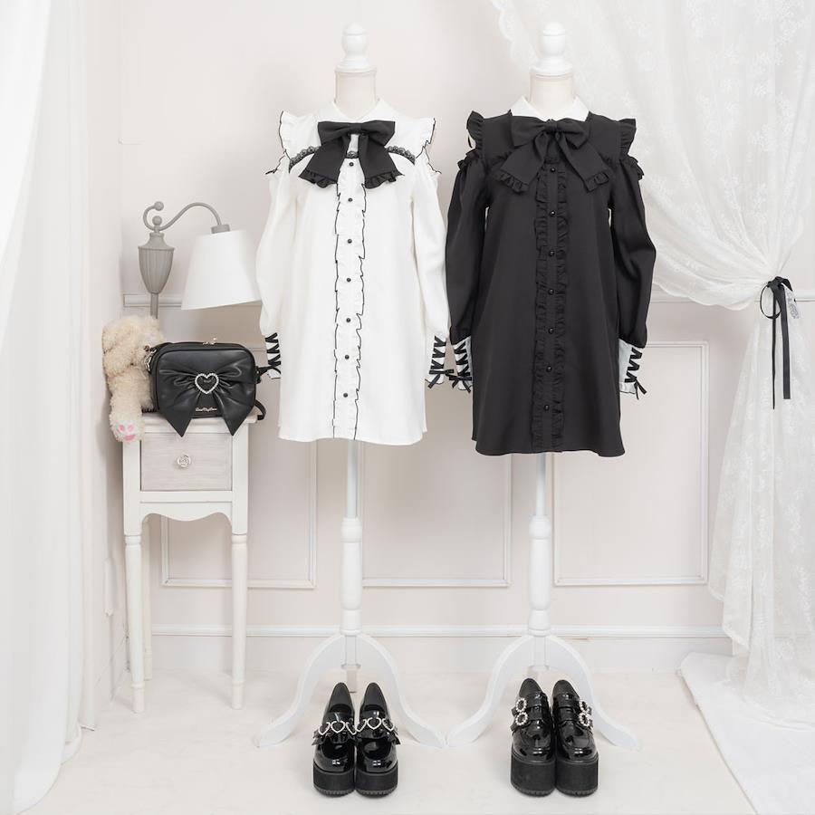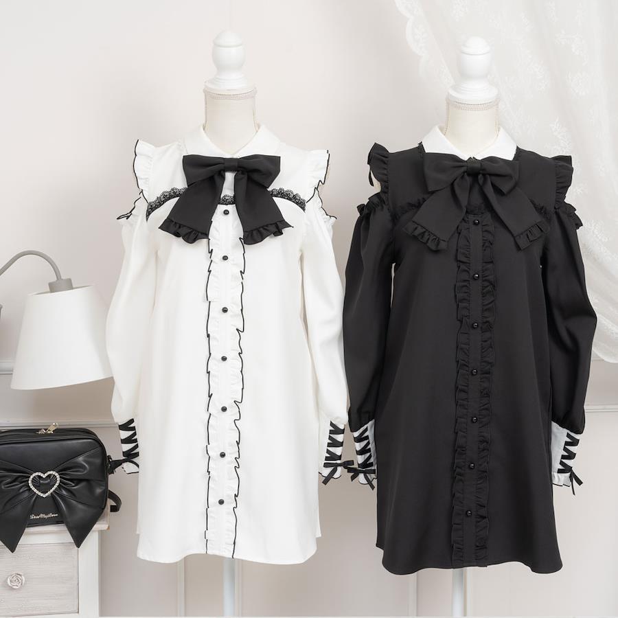 フリルたっぷりのかわいすぎる♪オフショルワンピースが登場【デザイン】フリルたっぷりの甘めのオフショルシャツワンピースです。後ろのヨークデザインにファスナーがあるのでそちらで着脱できます。襟元リボンにもフリルがついています。こちらは安全ピンで取り外し可能です。袖口カフス部分にはレースアップデザインがポイントになっていて、こちらは縫い付け仕様になっています。切り替え部分にはレースがポイントでついています。デザインポイントたっぷりのアイテムになっています♪【素材】しっかりとした素材になっています。ホワイトはインナーとインパンの着用をオススメ致します。【コーディネート】ハイソックスや厚底ローファーとの相性ぴったり♪かわいいリボンクリップと合わせて甘いシャツワンピコーデにしてみてください♪《透け感》カラーによってあり 《生地の厚さ》普通 《裏地》なし 《伸縮性》なし《生産国》中国