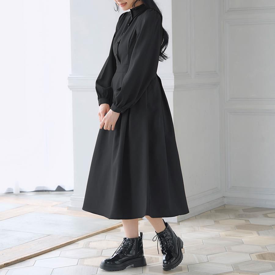 プチフリルをあしらったスタンドカラーが上品なデザイン。