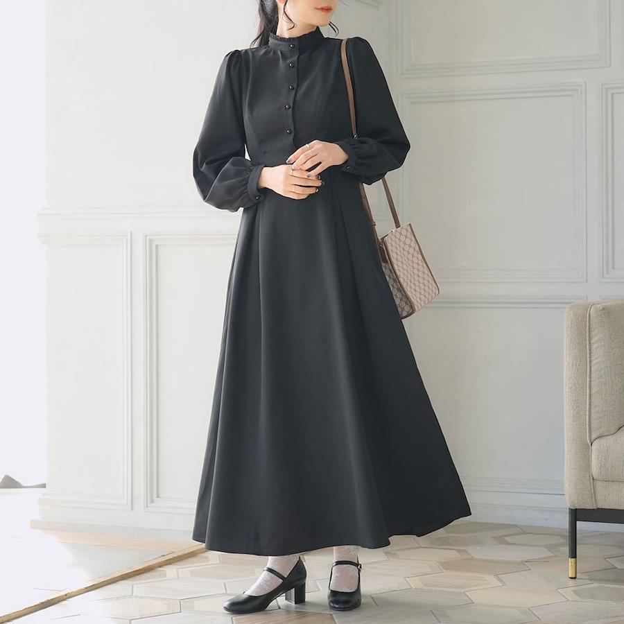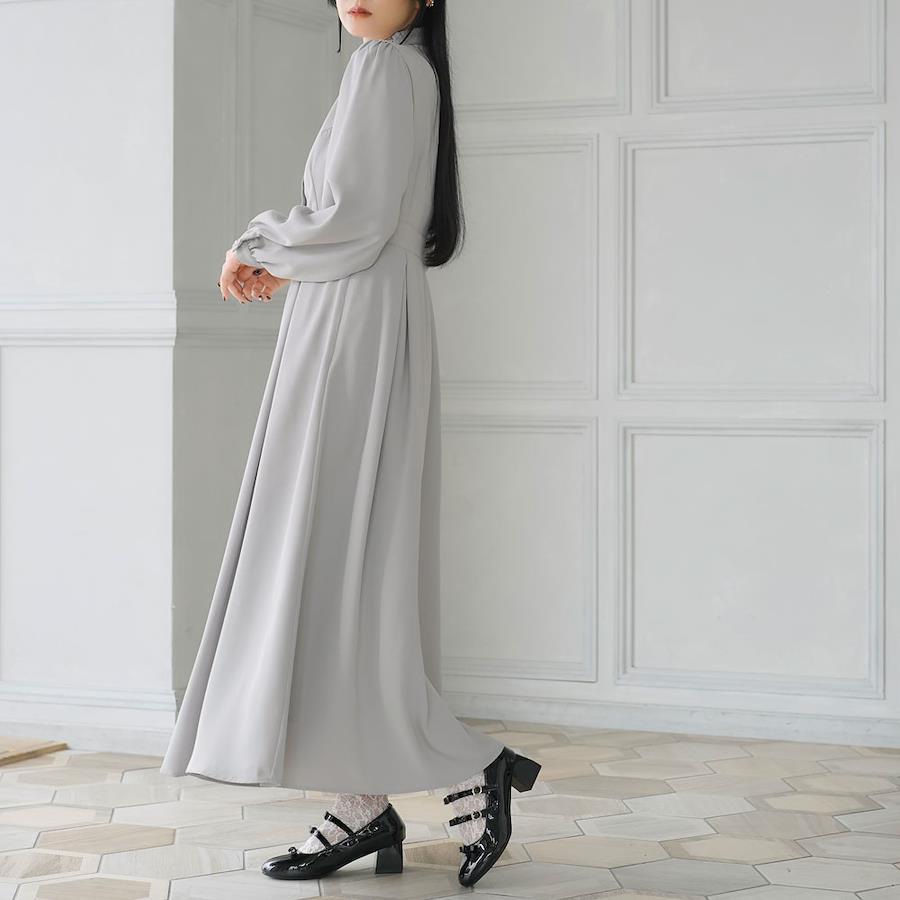 プチフリルをあしらったスタンドカラーが上品なデザイン。