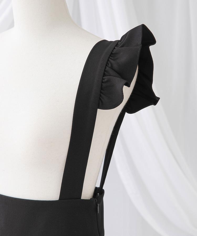 サスペンダーのフリルが肩まわりに愛らしさをプラスし、マーメイドシルエットは女性らしい美しいラインを演出します。