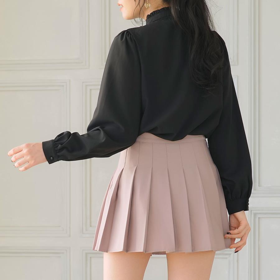 【デザイン】プチフリルをあしらったスタンドカラーが上品なデザイン。たっぷりとボリュームのある袖口も華奢見えポイント◎全体的にゆとりのあるデザインですが、程よい落ち感の素材で着膨れ感はゼロ。ボディ部分はあえてシンプルに、色々なアイテムに合わせられる便利アイテムです。