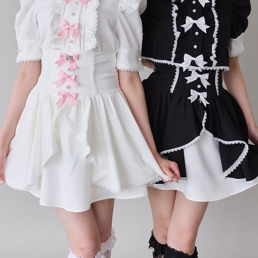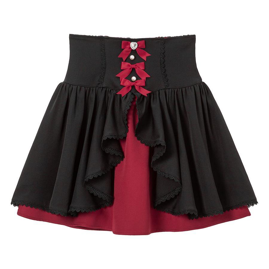 【デザイン】前中心のラッフルが上品クラシカルなコルセット風のスカートです♪ウエストのリボンとパールがポイントの主役級のアイテムになっています。後ろ中心にファスナー付きで後ろがゴムになっているので着脱しやすくなっています。ファスナーの引手はハートモチーフなのもポイントです。外側のスカートの裾にあしらわれたレースが上品さをさらにプラス!デートやお茶会にもオススメのアイテムです♪【素材】本体部分はしっかりした素材を使用しています。スカート部分に裏地付きです。後ろファスナーで着脱可能です。【コーディネート】同じ生地と色味のブラウスがございますので合せることでアイドルの衣装のようなコーディネートに仕上がります。パンプスやブーツに合わせるのがおすすめです。《透け感》なし 《生地の厚さ》普通 《裏地》あり 《伸縮性》なし《生産国》中国