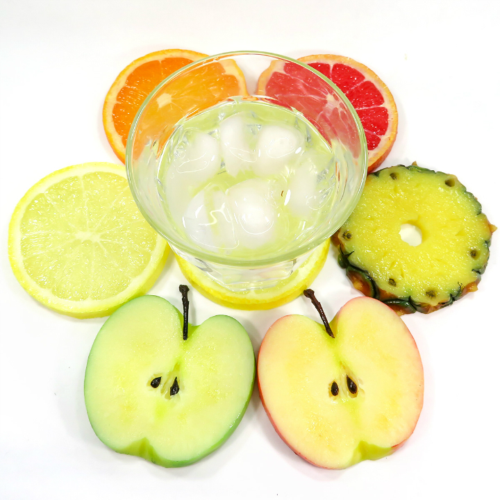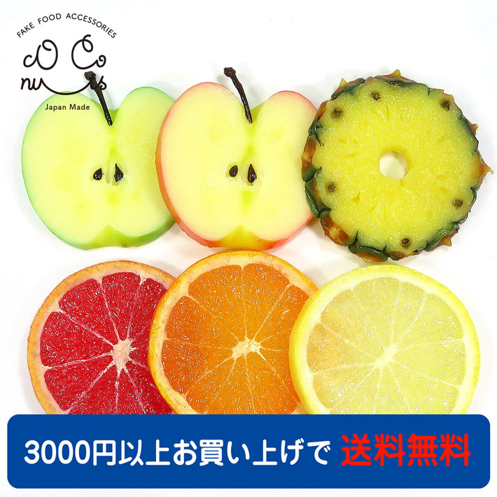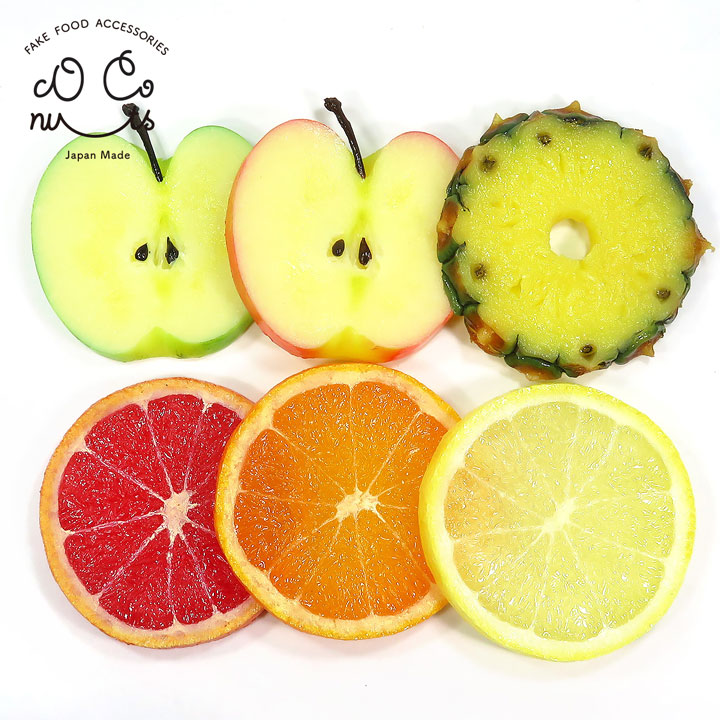 本物の薄切りの果物そっくりに作られたコースターです。皮の風合いやみずみずしい果肉はまるで本物です。従来品よりも少し小ぶりの直径約8cmです。パイナップル、リンゴ(赤、青)、グレープフルーツ(ホワイト、ルビー)、オレンジの6種類があります。 (スイカ、メロンは夏に発売予定)