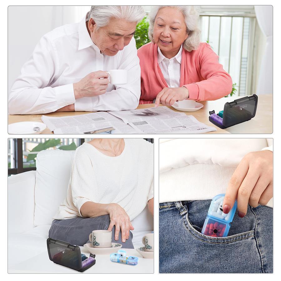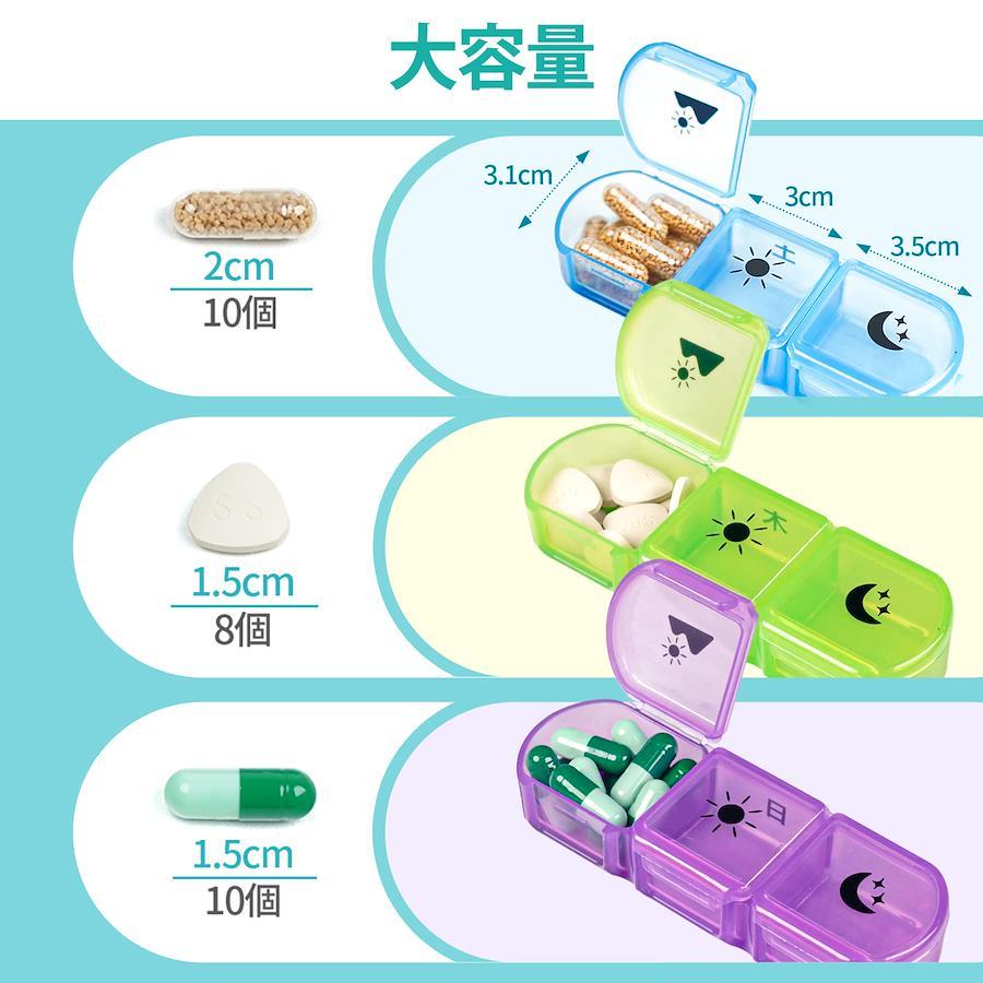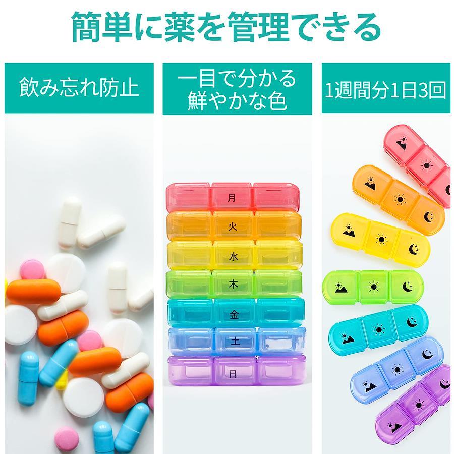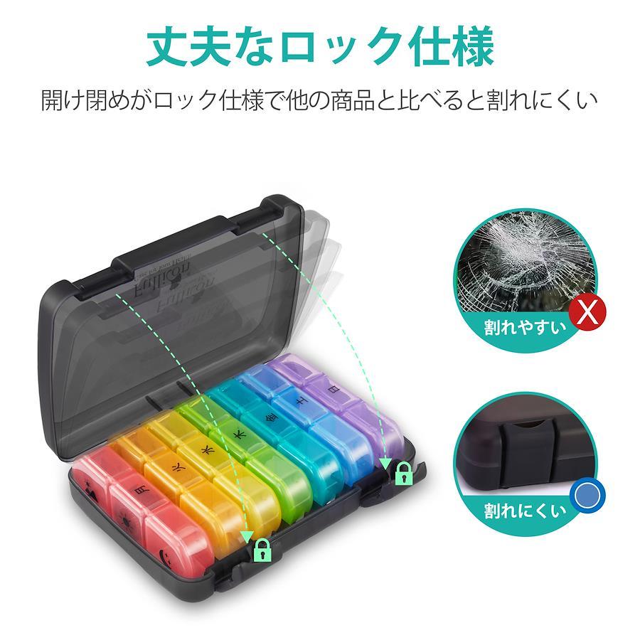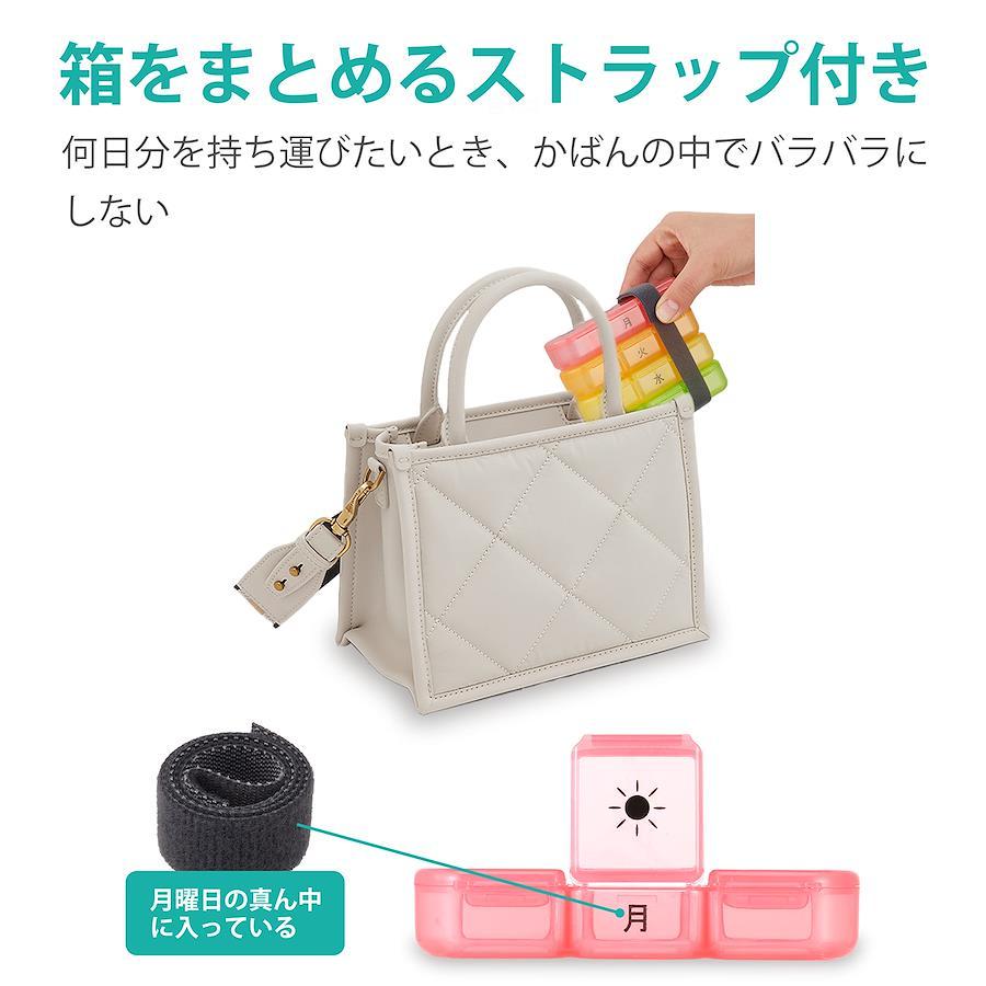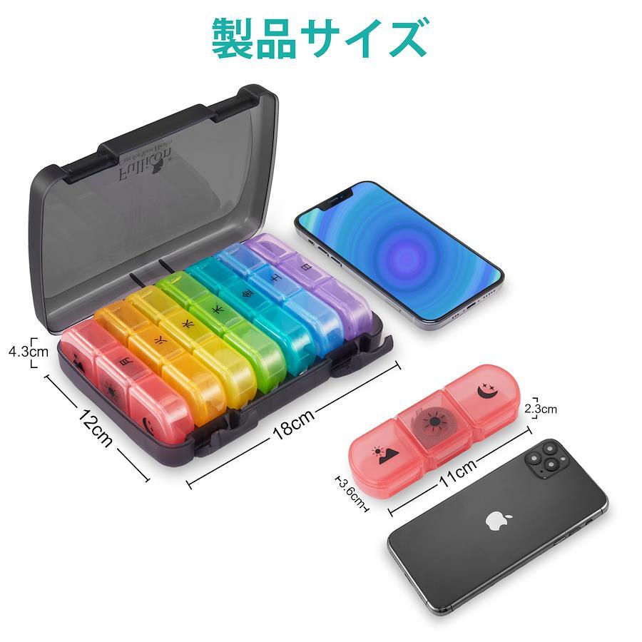 ??【商品仕様】[外ケース]サイズ:18 x 12 x 4.3cm。重さ:267g。色:黒。[中ケース]サイズ:11 x 3.6 x 2.3cm。重さ:19.6g。色:虹。 ??【丈夫なロック仕様】開け閉めがロック仕様で他の商品と比べると割れにくいです。 ??【一目で分かる鮮やかな色】毎日の色が違うので分別しやすい、飲み間違いしないです。 ??【持ち運びやすい】曜日ごとで分けているので、一日分や二日分の薬を持ち運ぶときに便利です。通勤や通学する時、出張する時、旅行する時など色々な場合にぴったりです。 ??【箱をまとめるストラップ付き】何日分を持ち運びたいとき、かばんの中でバラバラにしないです。(ストラップは月曜日の真ん中に入っている)