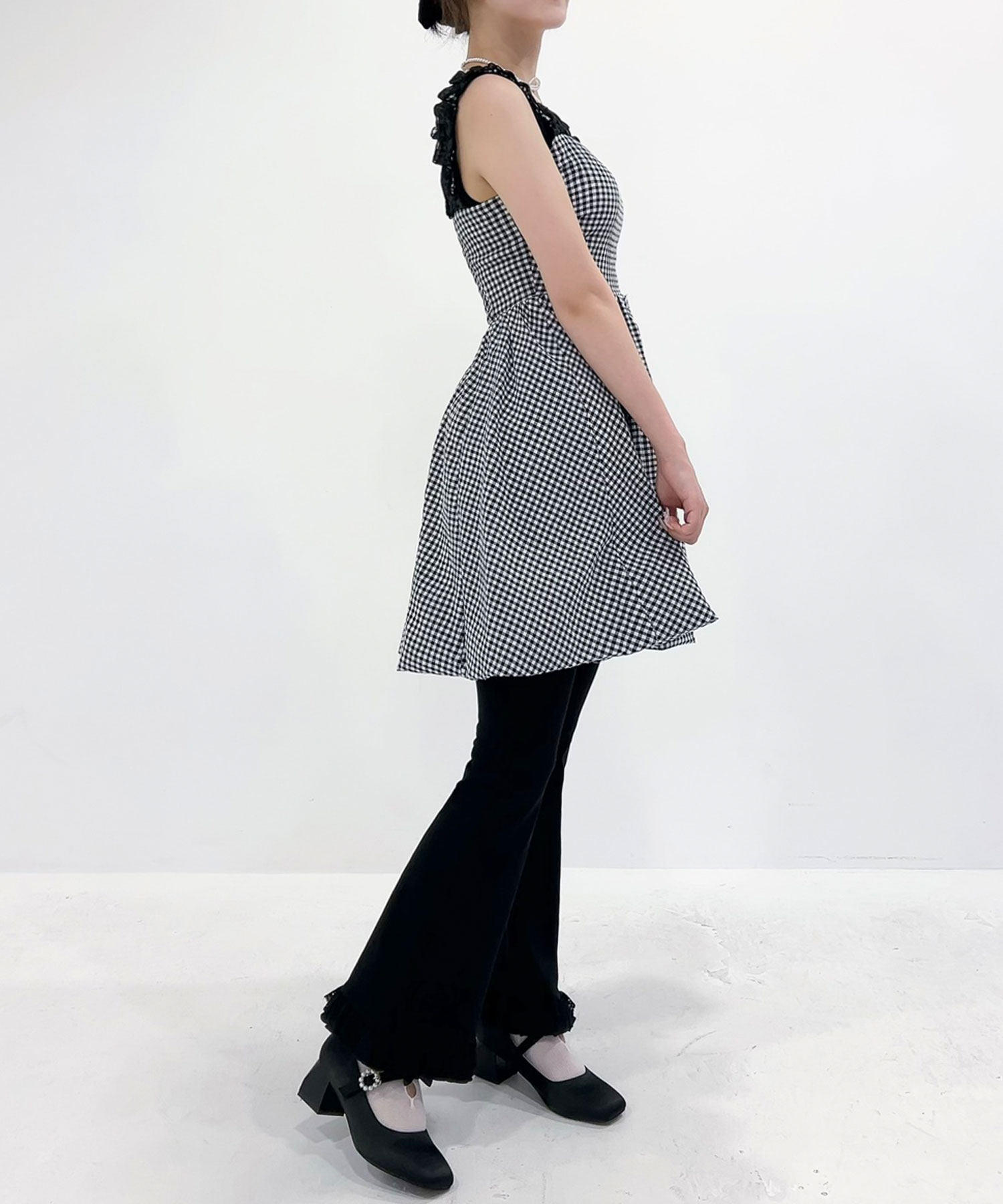 肩フリルは軽やかなオーガンジー素材で、可愛さを引き立てます。