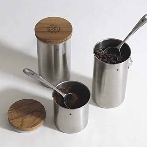 サイズ:幅8.5 × 高さ9.5 × 奥行8.5 (cm)素材:本体 /ステンレス(ヘアライン仕上)、木蓋 / チーク材生産:日本パッケージ:紙箱入り備考:[容量]コーヒー粉 / 約130g、コーヒー豆 / 約120g