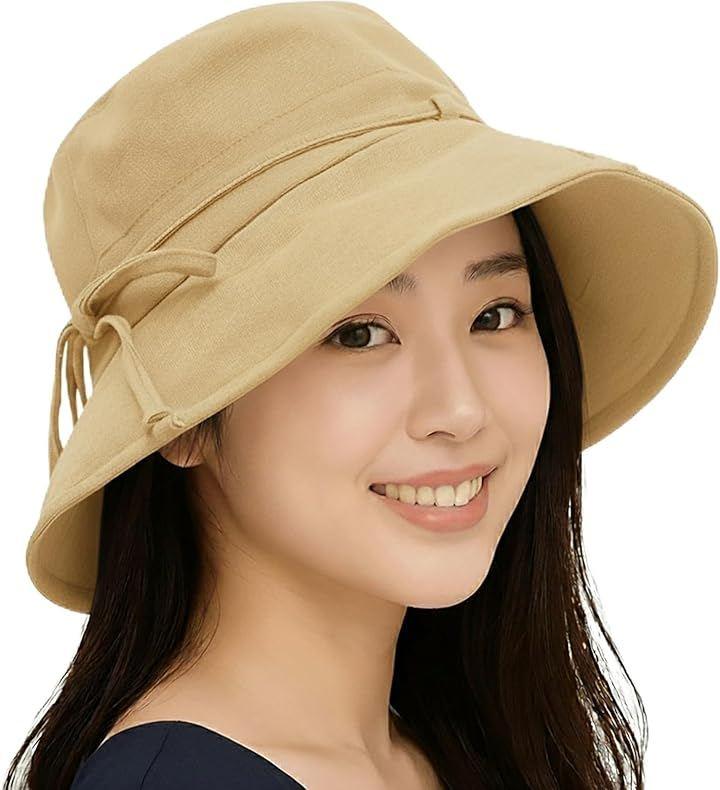 vUVカット帽子 材質:コットンxリネン、サイズ:Free Size、ツバの長さ:10cm、頭周り:約56-58cm(調節可能)、高さ:約10cm。