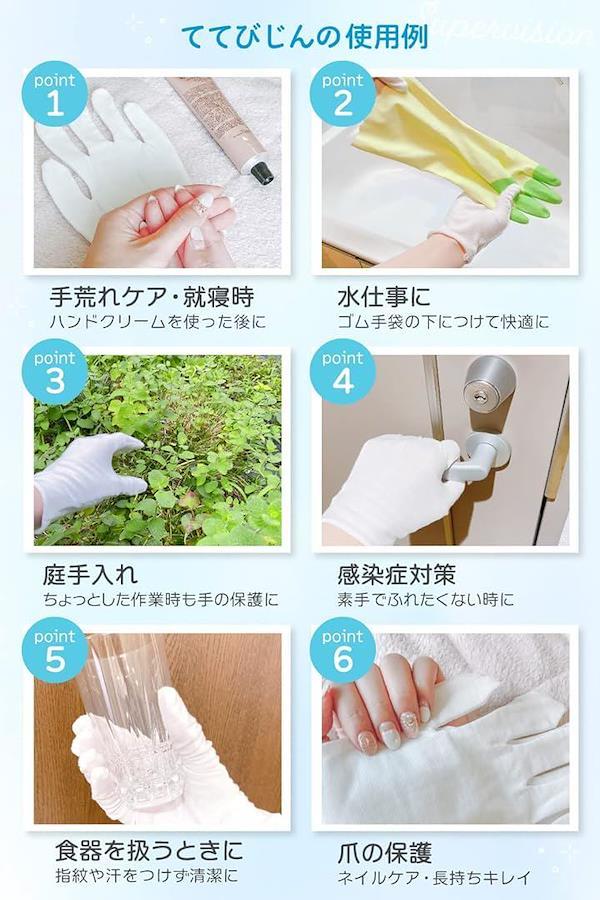 日本の第三者機関で検査を行い安全性確認済み* 厚生省が定めるホルムアルデヒド基準値合格* CCC ・ RoHS ・ ISO9000認証工場で製造しているため安心の品質* 「サイズ・使用」2サイズ(M・L)、左右兼用、男女兼用、洗濯可能なためいつでも清潔にご使用いただけます* 程よく伸びるのでフィット感も抜群* 手荒れ・乾燥・保湿ケアなど気にされる方などでお悩みの方にオススメです。
