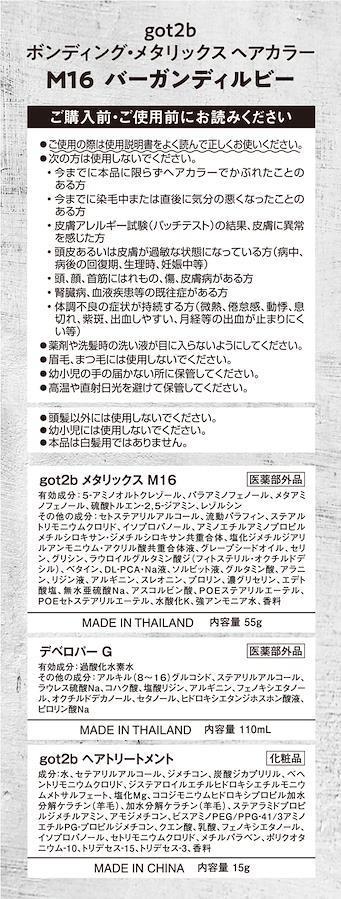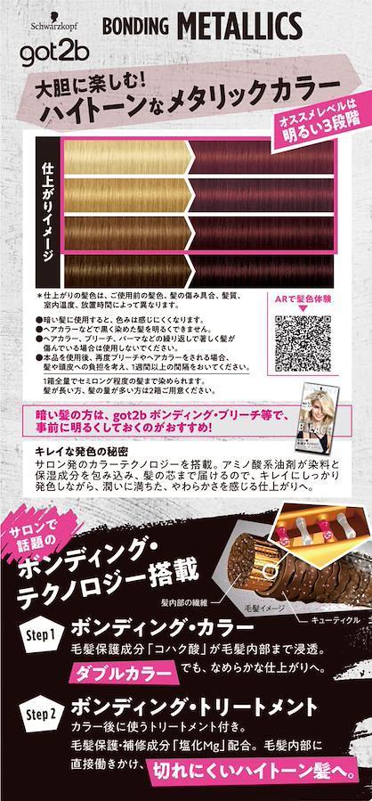 ボンディング・ブリーチ(毛髪保護成分「コハク酸」が毛髪内部まで浸透、ハイトーンなのになめらかな仕上がりへ。)ボンディング・トリートメント(毛髪保護・補修成分「塩化Mg」配合。毛髪内部に直接働きかけ、切れにくいブリーチ髪へ。)暗い髪の方は、got2bボンディング・ブリーチ等で、事前に明るくしておくのがおすすめ!キレイな発色の秘密(サロン発のカラーテクノロジーを搭載。アミノ酸系油剤が染料と保湿成分を包み込み髪の芯まで届けるので、キレイにしっかり発色しながら潤いに満ちたやわらかさを感じる仕上がりへ。)