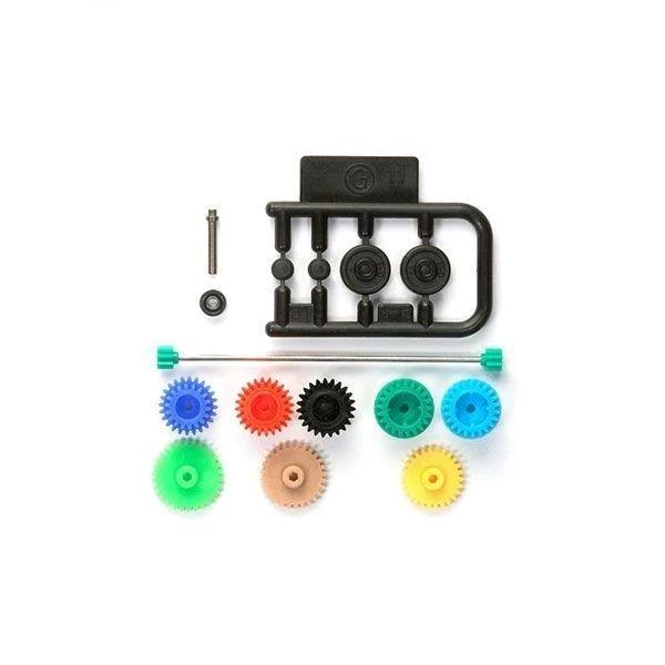 タミヤ 15456 ミニ四駆 GP.456 ARシャーシ セッティング ギヤセット3.5:1、3.7:1,4:1、4.2:1、5:1の5種類のギヤ比が選べ、セッティングを広げます。ギヤはもちろん、1.4mm中空軽量プロペラシャフト、620ボールベアリングもセットされています。 ミニ四駆パーツ ITEM No.15456