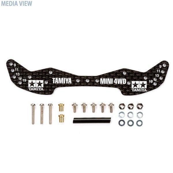 タミヤ 15498 ミニ四駆 GP.498 HG カーボンフロントワイドステー (1.5mm)9mm、11mm、13mm、19mmローラを規定幅いっぱいに取り付けられるカーボンフロントステーです。 FRPに比べ強度が高く、独特のパターンがレーシングムードをアップ。 タミヤオリジナルデザインのプリント入りで、パーツ取り付け穴が多く設置されております。 (MA、MS、AR、VS、SUPER-II、XXシャーシに装着可能。※一部のシャーシまたはボディは加工が必要です) ミニ四駆パーツ