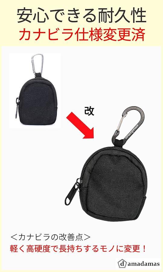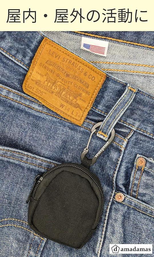 サイズは縦8.5cm、横6.5cm、幅2.5cmとコンパクトながら、小銭、鍵、薬、イヤホン、お守りなども収納可能。