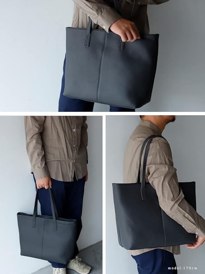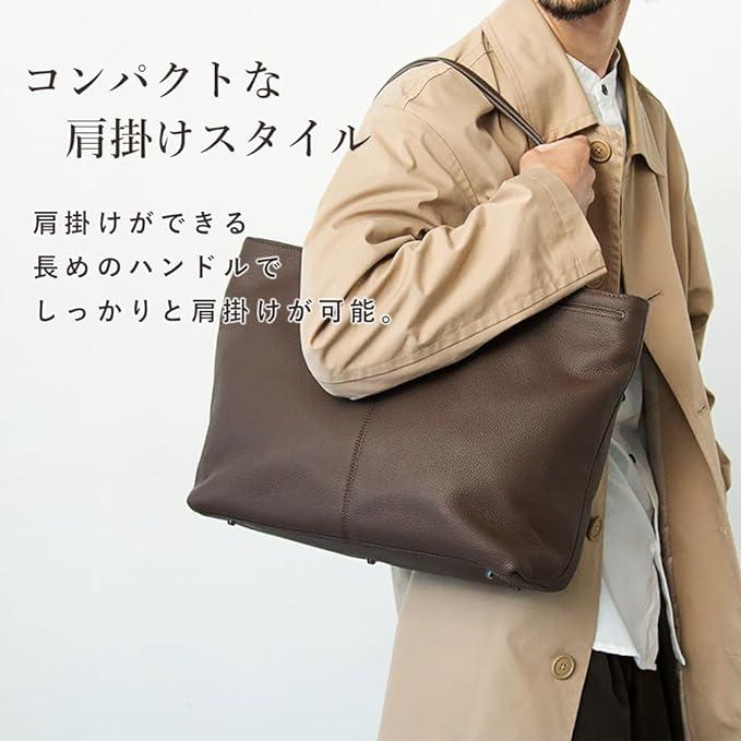 働く男性向けの、リアルレザービジネストートバッグ。 柔らかくて丈夫なシュリンクレザーを使用した、長く使えるシンプルなデザイン。 A4サイズや雑誌なども収納ができるので、書類などが多い方も安心です。 ハンドルは長めの仕様なので、アウターの上からも肩掛けが可能。 高級感のある大人デザインでスーツスタイルはもちろんカジュアルにも合います。