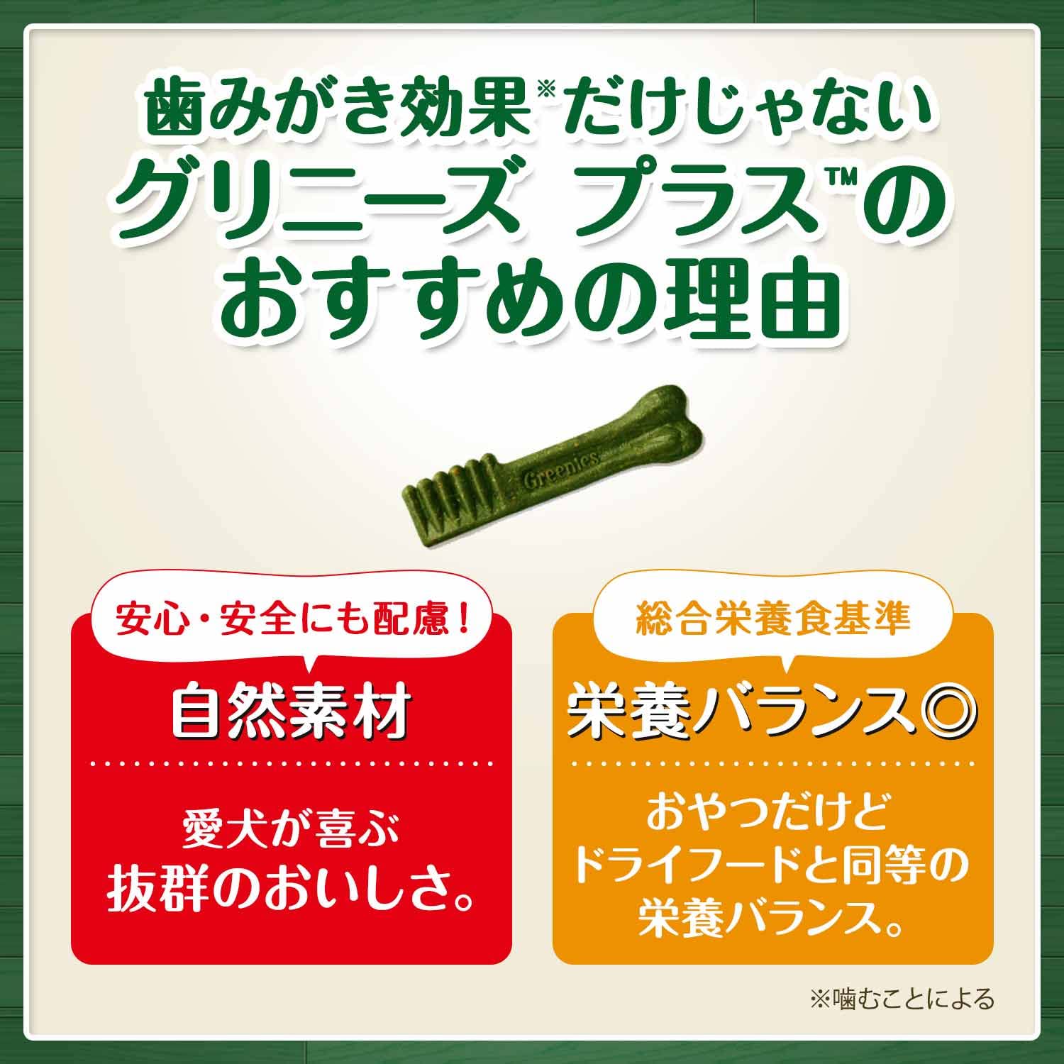 アレルゲンとなりにくいと言われる原料を使用体重別のカテゴリーで最も噛む力の弱いワンちゃんでも安心して噛める硬さ、さらに歯垢除去効果の高い、適度な弾力性とデザインを研究しつくしました。日本の愛犬のために生産し、日本でも試験を行っています。高温多湿の日本での販売を前提にバリア性の高いパッケージを使用しています。総合栄養食