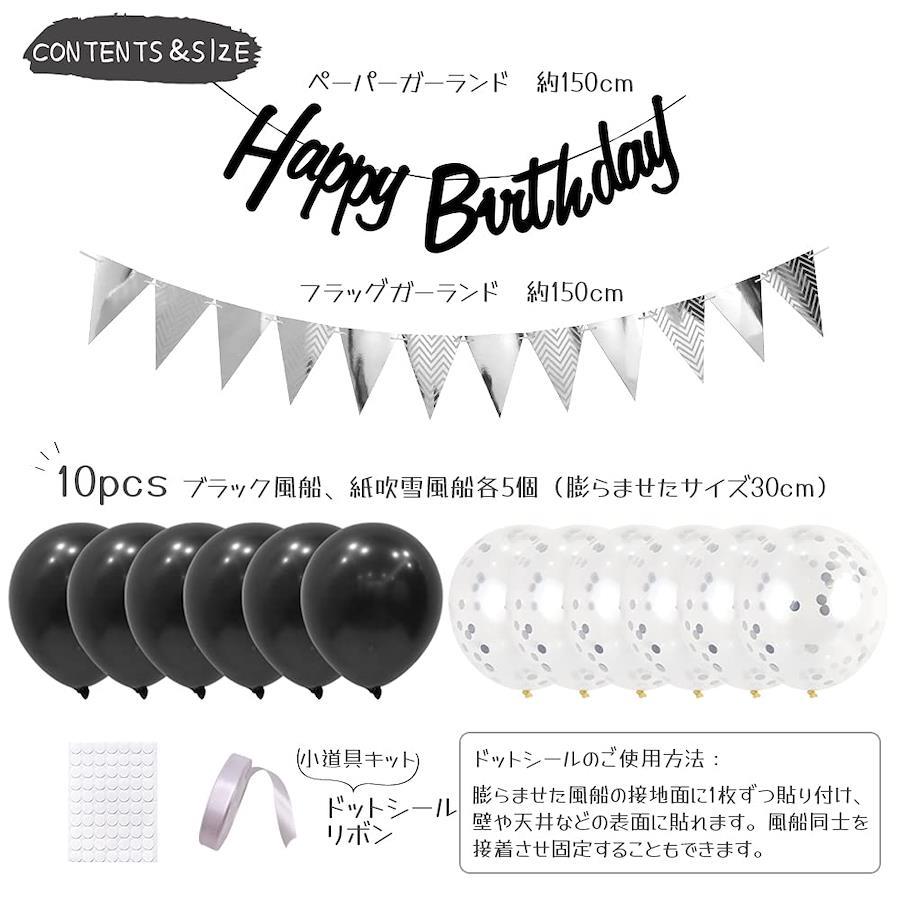 誕生日のお祝いを盛り上げてくれるハッピーバースデーバルーンセット!お友達や大切な人の誕生日サプライズ。思い出に残るとっておきサプライズとして、お部屋の中を風船でいっぱいにする演出はいかがですか?セット内容(取り扱い:対象年齢6+以上):①フラッグガーランド1点 ②Happy Birthdayペーパーガーランド1点 ③紙吹雪バルーン(30cm)5点 ④ブラックバルーン(30cm)5点 ⑤リボン1点 ⑥ドットシール1点記念すべき誕生日を祝うのにピッタリ♪組み合わせ次第では出産祝い、結婚式、記念日、他の様々なパーティーなどにも適用されます。その他にも記念撮影の飾りにしても素敵です。手軽に準備でき、思い出に残る楽しい写真が撮れます。【おうちを楽しく飾ろう!】GRESATEKはホームパーティー向けのバルーン・デコレーションを中心にお誕生日、出産祝い、100日祝い、結婚式、記念日、サプライズパーティーなど様々なシーンに使える、気軽に楽しめるかわいいパーティーグッズを各種取り揃えたパーティー雑貨の専門店です。【免責事項】メーカーによる商品リニューアルに伴いパッケージ(内容量も含む)変更が行われた場合、新パッケージでお届け致します事ご了承願います。