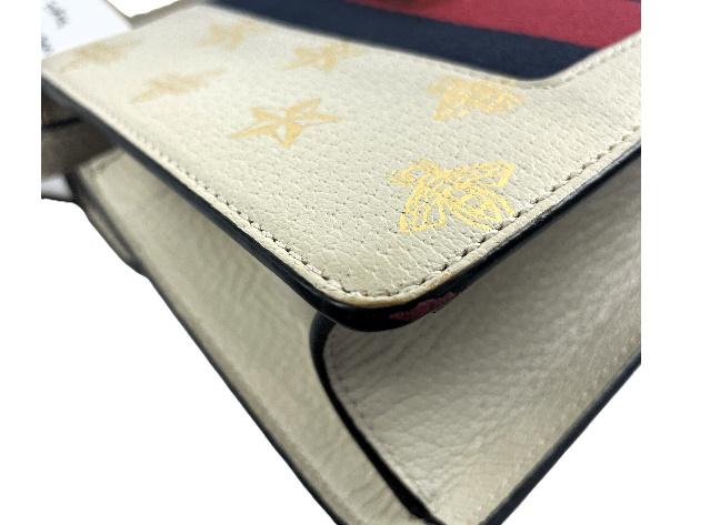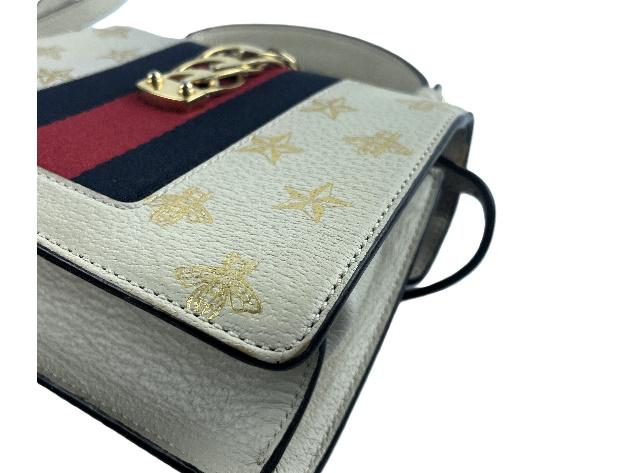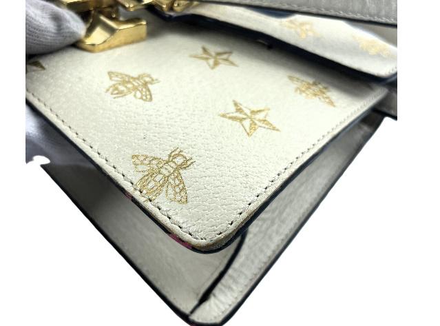 グッチの人気ライン「シルヴィ」から、アイコニックなゴールドチェーンとビー&スター(蜂と星)のモチーフが印象的なショルダーバッグです。クラシカルなフォルムにウェブライン(赤×ネイビー)が映える、グッチらしいエレガントなデザイン。2WAY仕様で、ハンドバッグ・ショルダーバッグどちらでもお使いいただけます。