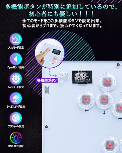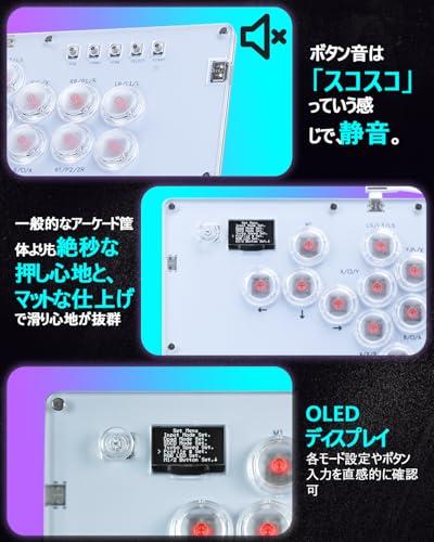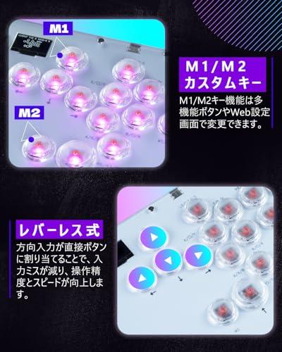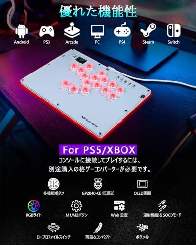 【??業界初の多機能メニューボタン搭載】業界初のオールインワンボタンを備えたレバーレスコントローラー、全ての機能をワンメニューボタンで設定可能、入力モード、Dpadモード、Socdモード、ターボスピード、プロフィール、RGB LEDなど。初心者からプロまで、誰でも使いやすいデザインになっています。このレバーレス アケコンは、競技シーンでの使用に最適化された格闘ゲーム用入力デバイスです。 【??最適な利点】すべての機能をワンメニューボタンで設定可能、一般的なアーケード筐体よりも押し心地が抜群。ボタンリムの追加とマットな仕上げで、運指が本当に絶秒。ボタン音は「スコスコ」で静か。さらに、格ゲー熱を盛り上げるRGB雰囲気ライトがバックパネルに付いていて、カラフルなゲームの雰囲気を演出します。 【高精度??高反応】方向入力が直接ボタンに割り当てることで、レバー操作よりも正確かつ高速な入力が可能です。コマンド入力や間隔管理がより速く、より正確に行えるため、間合いの取り方で勝敗を決める格ゲーに最適。また複数ハードに対応しておりPC/Switch/Steam Deck/PS3/PS4/ArcadeおよびAndroidデバイスで使用出来ます。PS5やXBOX本体に接続する際に、格ゲーコンバーターが要ります。互換性を確保するには、PS5に対応するコンバーターやXBOXに対応するコンバーターをぜひ別途ご購入頂けます。XBOX本体のみで使用する場合はバージョンアップが必要ですが、具体的なバージョンアップ方法は商品ページに掲載されている操作動画をご覧いただけます。 【??優れた機能性】デザイン面もシンプルで高級感があり、コンパクトで持ち運びにも困らずカスタム性も高いので長く使えます。方向キーを同時押しした際の細かい設定やボタンのマッピング機能や連射機能もあり機能面でも優れています。薄型かつ天面が広いので操作性や使い勝手も抜群に良い。左上には液晶ディスプレイ付きで、ボタン入力を直感的に確認可。またキースイッチのホットスワップに対応しており簡単に別のキースイッチに交換出来ます。アクリル板で基盤を挟んだシンプルな構造ですが、非常にきれいなつくり、裏面がマットなクリア素材で基盤が透けて見えます。 【??低遅延&静音】アケコンの悩み「音」を解消した。レバーレスの方が音は抑えられているけど、格闘ゲームはボタンを連打するから、周りの人がうるさいと感じることもある。その音で自分の戦略が漏れる可能性もある。でも、「音」に関しては、キーボードメーカーの技術が活かされている。これまでの開発経験から、内部構造に最適な静音設計が施されているので、心地よい打鍵音を楽しんでほしい。基盤が低遅延のRaspberry Pi Pico GP2040-CEを搭載、全てのモードでの入力遅延が1ms以内で、超高速ポーリングレートを実現します。 【??GK-16白のパッケージ内容】製品サイズ 300*210*10mm、重さ902g。ボタンサイズ 大きめ25.8mm 小さめ20.7mm ①USB-C ケーブル×1、②USB延長コード×1、③スタンド*2、④滑り止めパッド×1枚、⑤ゴムマット×1枚、⑥ボタンキャップ*2、⑦ゴムキャップ*1、⑧ネジ*2、⑨キースイッチ*2 【Booter5 コンバータ(別売り必要)をPS5やPS4で接続する場合】 GK16で起動時のデフォルト入力モードはPS5モードです。そうでなければ、多機能メニューボタンでPS4モードをPS5モードに切り替える必要です。Booter5コンバータをGK16のExtポートに差し込み、GK16のYボタンを押しながらPS5コンソールに接続します。次、ホームボタンを押せばPS5のゲームをプレイできます。また、PS4コンソールを直接PS5モードでも利用出来ます。そのままbooter5コンバータをGK16のExtポートに差し込み、GK16のYボタンを押しながらPS4コンソールに接続してPS4のゲームも上手くプライ出来ます。