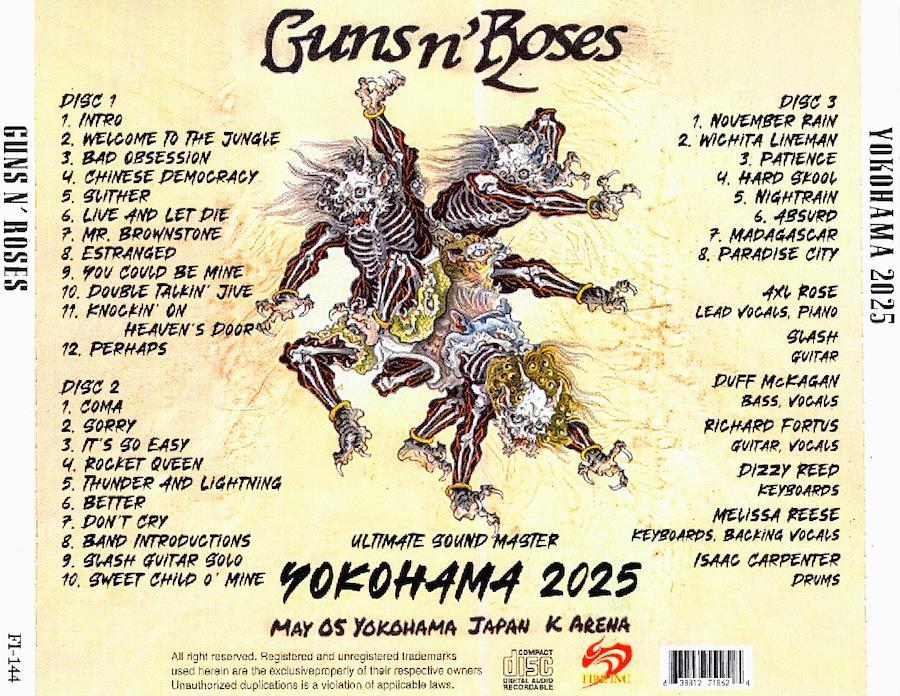 ガンズ・アンド・ローゼズの2025年5月5日、Kアリーナ横浜での3時間にも及んだ一夜限りの奇跡のパフォーマンスをオーディエンス最高峰の極上音質で3枚組に完全収録。今回の日本公演は約2年半ぶりで2016年にアクセル・ローズがスラッシュ、ダフ・マッケイガンとの再合流を経てから3回目となり、5月1日に韓国で幕を開けたばかりの『Because What You Want & What You Get Are Two Completely Different Things』と銘打たれたツアーの2公演目にあたるライブ。数々の名曲や世界初公開となるジョン・サイクスに捧ぐ「Thunder And Lightning」を披露するなど全27曲、語り継がれるであろう伝説となる3時間を超える圧巻のパフォーマンス。ファンを魅了した一夜限りの最高のライブを極上音質で存分にお楽しみ頂けます。