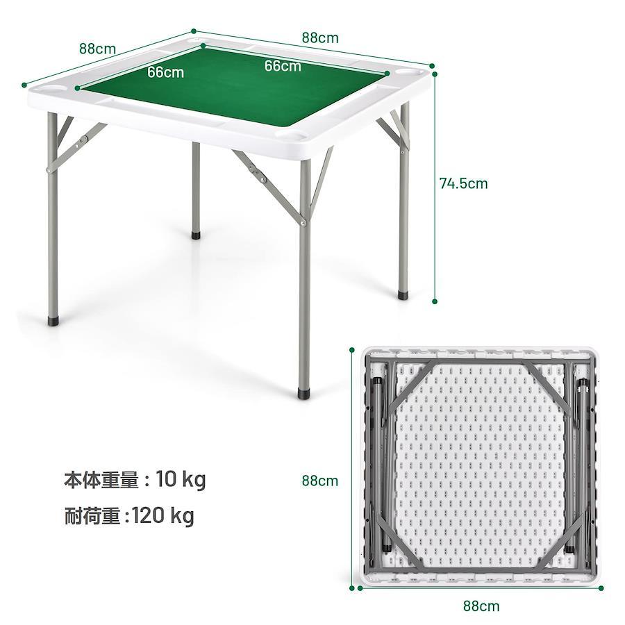 GYMAX 麻雀卓 折り畳み 雀卓 マージャンテーブル マージャン卓 麻雀台 耐荷重120kg 幅88x奥行88x高さ75cm マージャン 麻雀 テーブル おりたたみテーブル マージャンマット カップホルダー付き ★本体サイズ(約)幅88x奥行88x高さ75cm ★折り畳みサイズ:幅88x奥行88x高さ5cm ★本体重量:10kg ★耐荷重:120kg ★材質:鉄+PE+PVC 【多目的麻雀テーブル】表面が平らで、麻雀、ポーカー、ドミノ、ブラックジャック、テキサスホールデムなど様々なテーブルゲームに最適な多目的折りたたみ麻雀卓です。そのため、クラブ、バー、ゲームルーム、家庭など、さまざまな場面で非常に適しています。 【折りたたみデザイン&持ち運びが簡単】従来の麻雀卓とは異なり、この麻雀卓は楽々と折りたたむことができ、使用しないときはスペースを節約することができます。さらに、旅行やキャンプの際にも持ち運びが可能です。また、安全性にも配慮し、折りたたんだ脚を固定するセーフティーロックを設け、取り扱い中に脚が外れないように設計されています。 【広々としたテーブルトップ】88cm×88cmの雀卓は、麻雀牌やトランプなどを置くのに十分なスペースがあります。同時に、プロ仕様のPVCテーブルトップは耐摩耗性に優れており、ゲームの楽しさを存分に味わうことができます。 【便利なカップホルダー&麻雀凹み】この麻雀卓は4つのカップホルダーと4つのチップ凹部があり、プレイヤーに大きな利便性を提供します。カップホルダーがはめ込まれているので、カップをきれいな状態に保ち、飲み物がこぼれるのを防いでくれます。さらに、丁寧に作られた麻雀の凹みは、プレイヤーが麻雀牌を整理するのに役立ち、特に初心者に優しいものとなっています。 【頑丈な構造&滑り止めデザイン】高品質のPE材料とパワーコーティングされた鉄フレームで作られ、この麻雀卓は非常に頑丈で耐久性があります。また、滑り止めの付いた脚は、床を傷から守りながら安定性を高めます。ハニカム構造により、120キロまでの重量に耐えられるマージャン卓です。 ※麻雀牌は別売りです。予めご了承ください。