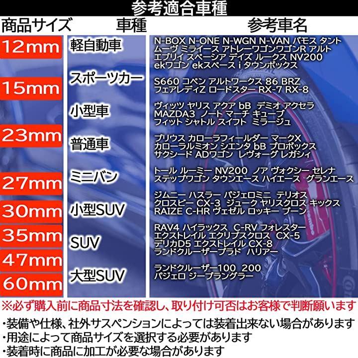 スプリングの密着による異音解消効果ショックを吸収し乗り心地の向上冬場や点検時など一時的な車高調整アイテムとしても使える不要な沈み込みを抑制し走行の安定性向上にも活躍しますバネとサイズが合えば前後左右問わず取り付け可能です2個セットです