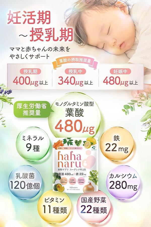 このサプリは、「厚生労働省推奨量」のモノグルタミン酸型葉酸480㎍をはじめ 鉄22mg ,カルシウム280mg,葉酸の働きをサポートする59種類の栄養素をもつユーグレナ、そして乳酸菌120億と高配合。