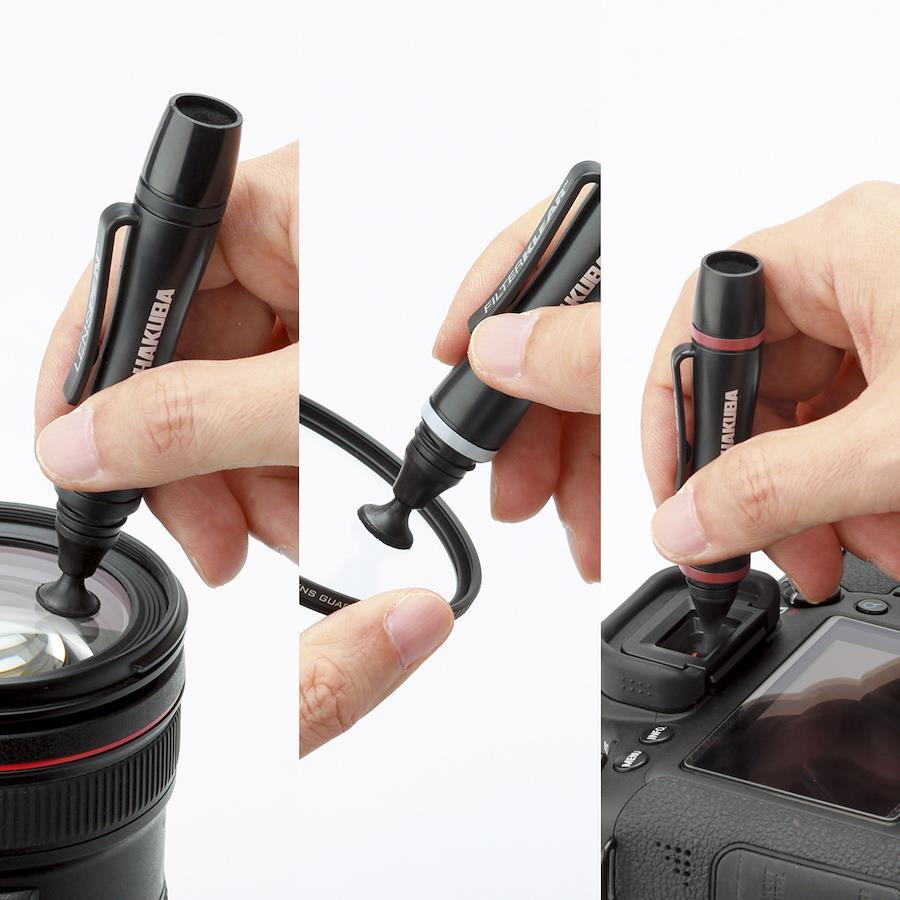 ■外出時でも簡単クリーニング。あると便利なレンズペンセーム革を使用した特製チップが皮脂や指紋を吸着して驚くほどキレイにすると同時に、カーボン粉末が静電気を除去しホコリの付着を防止します。ペンタイプなのでかさばらず、ポケットに入れて持ち運びが可能。クリーニング液不要で使い方は簡単、マルチコートレンズにも使用できます。