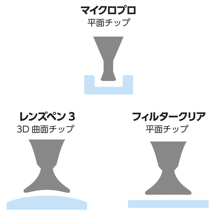 ■レンズ・フィルターファインダーがこの3本で簡単メンテナンスレンズの局面にフィットする3D曲面チップのレンズペン、平面ガラスに最適なフィルター用のフィルタークリア、狭いところに届く極細チップで普段掃除しにくかったファインダーをきれいにするマイクロプロの必需品3本が一つのキットになっています。