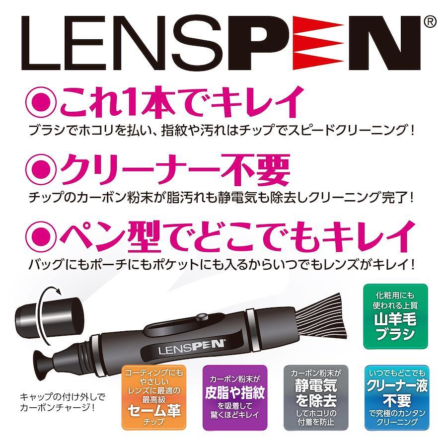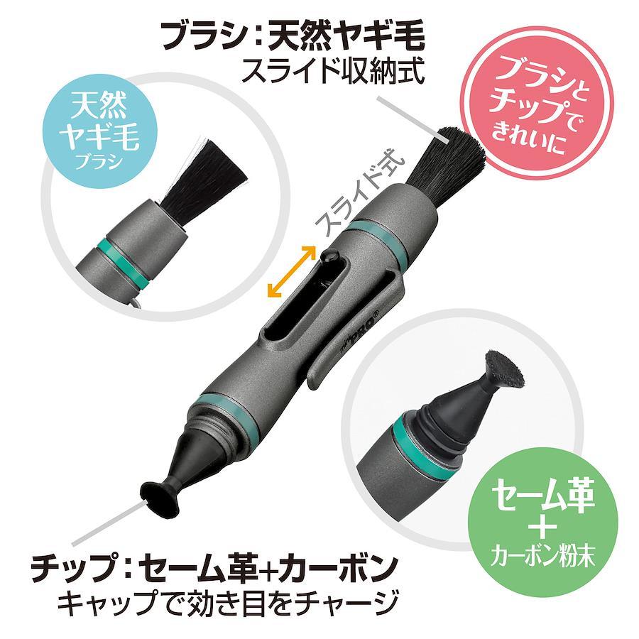 カーボン粉末とセーム革チップで指紋を拭き取る人気のレンズペン。セーム革製チップ+カーボン粉末(特許)で指紋や皮脂を残さず確実に吸収し、さらに静電気を除去してホコリをつきにくくします。