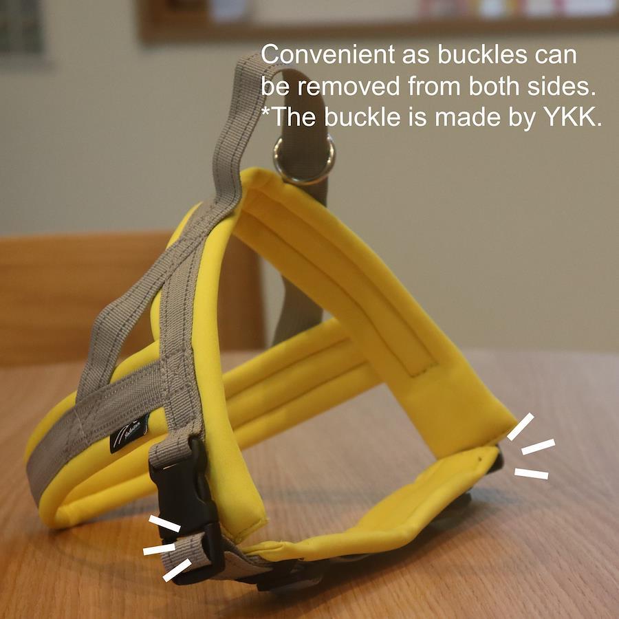 ・The latest upgraded model of Hakusan’s classic T-shaped “First Harness” with improved functionality and wearing comfort.・New dog harness model launched in “the year of the Rabbit” in the Japanese zodiac.・The traditional T-shaped dog harness is easy to put on and take off with its simple ergonomic design.・Lavishly padded with soft cushioning neoprene material, the highly durable and strong harness ensures a perfect fit for any kind of dog.・Equipped with bright reflective stitch lines sewn into the webbing, top-quality YKK plastic buckles and a useful handle on back.・Available in a wide range of colors and sizes.