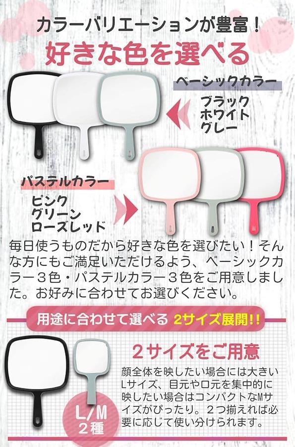 「商品特徴」 大きくて見やすい:顔全体を映せる大きくて横長のデザイン 肌触りの良い素材:フレームと持ち手は滑りにくい素材 2サイズから選べる:用途にに合わせてL・Mの2サイズから選べる 豊富なカラー展開:落ち着いた色合いの6色をご用意