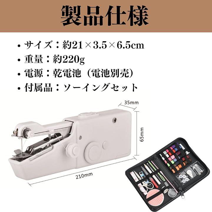 「製品仕様」サイズ:約21x3.5x6.5cm 重量:約220g 電源:単三乾電池4本(電池別売) 付属品:ソーイングセット カラー:ホワイト *単三乾電池4本を原動力としているため、大型ミシンに比べるとスピードが遅くなります。