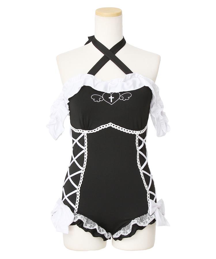 オフショルダハート十字架レースアップ水着キュートでゴシックな雰囲気を持つ個性派デザインの水着が登場♪胸元には天使の羽とハート、クロスがデザインされた刺繍が施されており、甘さの中にも少しゴシック風な魅力が漂います。肩にはオフショルダー風のフリルがついており、首元のクロスストラップがデコルテを美しく見せてくれます。サイドにはコルセット風のレースアップデザインがあり、ウエストラインをすっきりと見せながら、細部までこだわったディテールが目を引きます。裾には配色のリボンと十字架柄のレースをあしらい、ゴシック風と上品さをプラス。